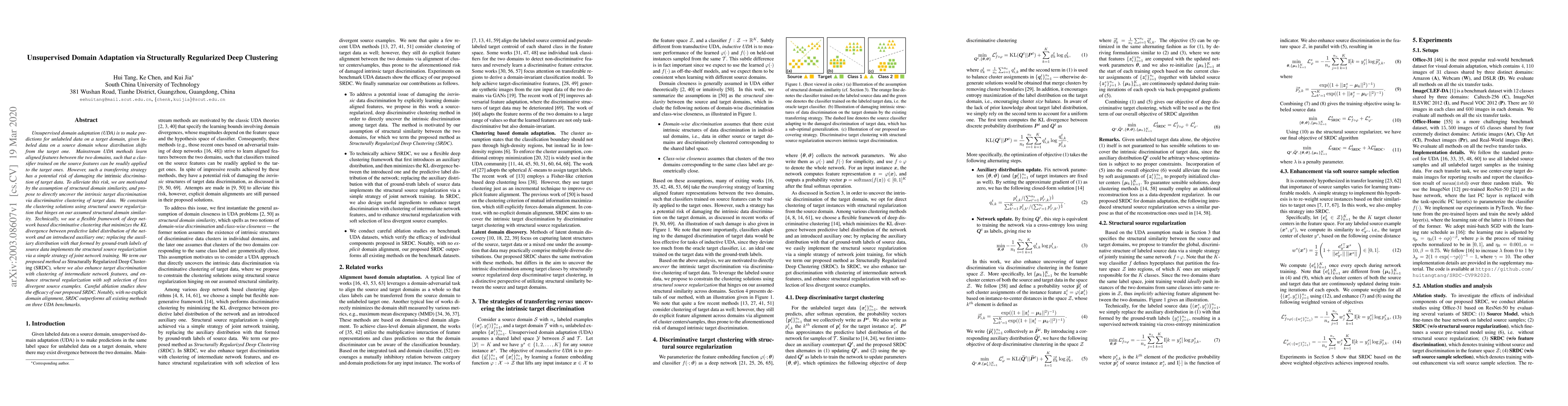 The paper proposes Structurally Regularized Deep Clustering (SRDC) for unsupervised domain adaptation, which leverages discriminative clustering of target data and structural source regularization to maintain intrinsic target discrimination without explicit domain alignment, achieving superior performance on UDA benchmarks.