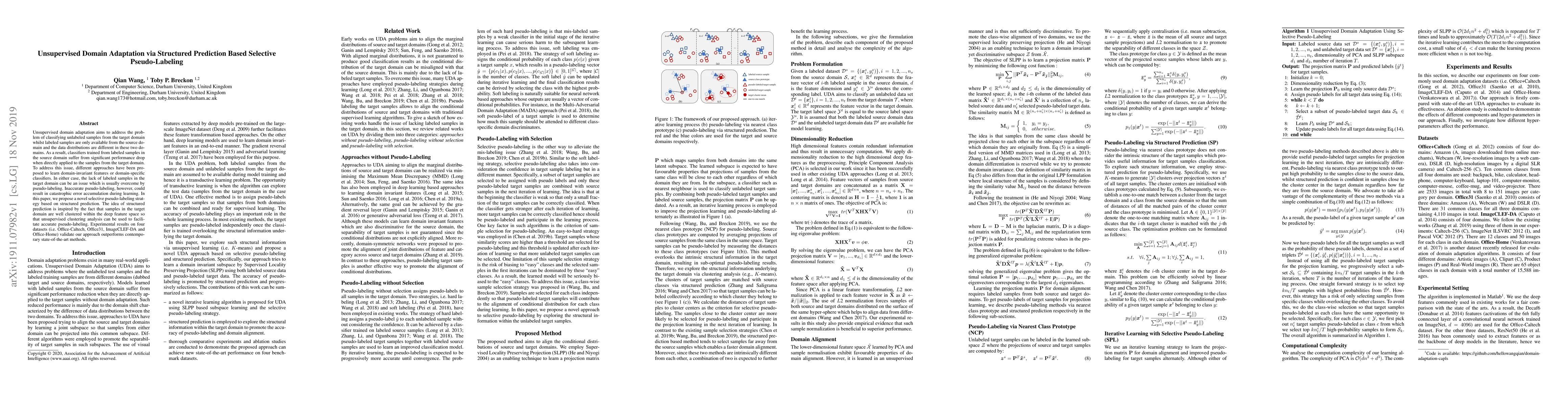 This paper proposes a novel unsupervised domain adaptation method that utilizes selective pseudo-labeling based on structured prediction to improve classification accuracy for unlabeled target domain samples. The approach leverages unsupervised clustering in the deep feature space to generate more accurate pseudo-labels, outperforming state-of-the-art methods across multiple datasets.