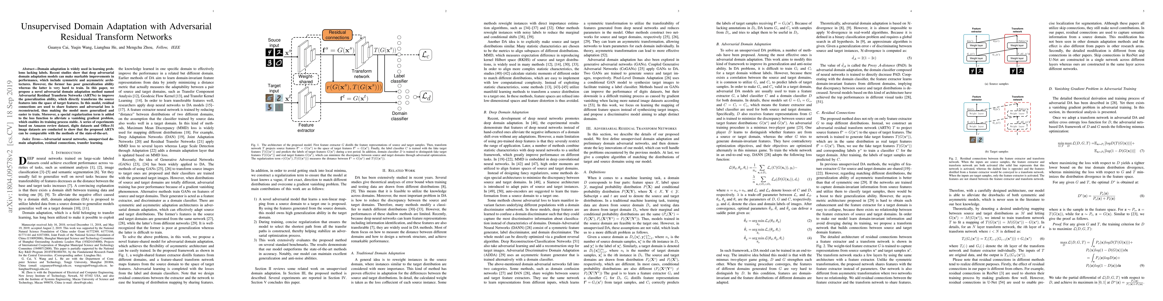 This paper introduces Adversarial Residual Transform Networks (ARTNs) for unsupervised domain adaptation, aiming to improve generalization ability. ARTNs use residual connections and adversarial loss to transform source features to target feature space, with a regularization term to stabilize training, achieving state-of-the-art performance on various datasets.