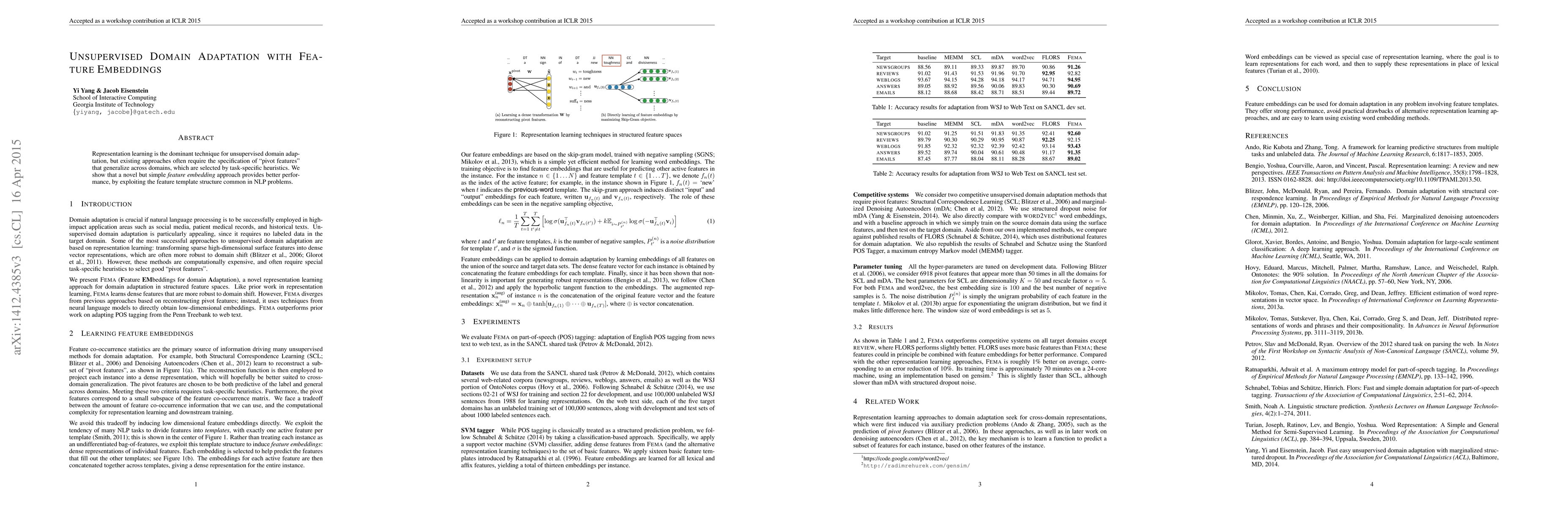 Summary: This paper proposes an unsupervised domain adaptation method that leverages feature embeddings to improve performance without relying on task-specific heuristics for selecting "pivot features," instead exploiting common feature template structures in NLP problems.