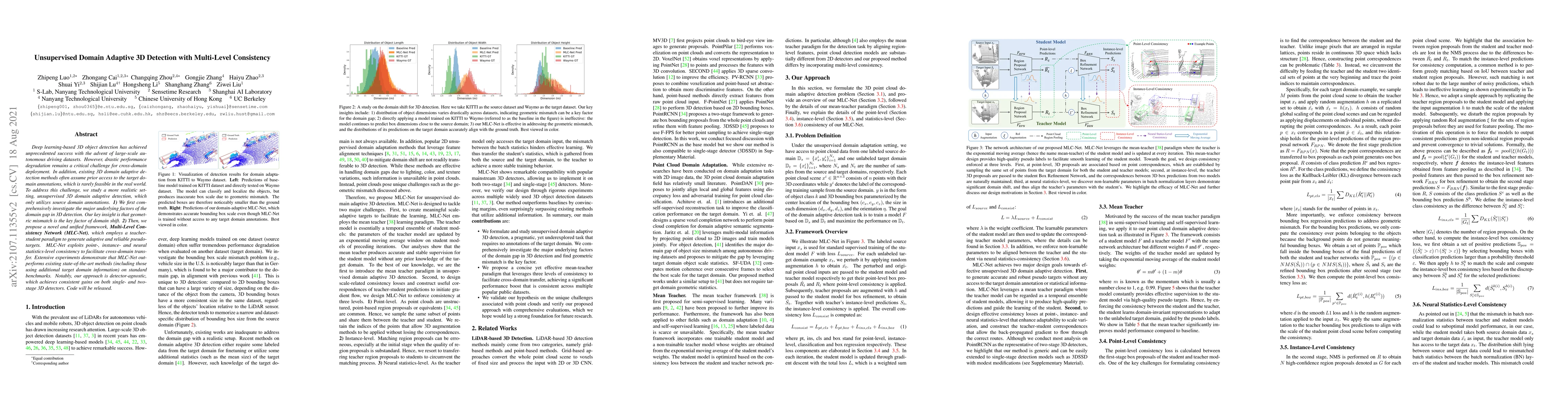 This paper introduces a framework called Multi-Level Consistency Network (MLC-Net) for unsupervised domain adaptive 3D object detection, focusing on reducing performance degradation across different domains without requiring target domain annotations. MLC-Net leverages geometric consistency at multiple levels to bridge domain gaps, leading to superior performance compared to existing methods.
