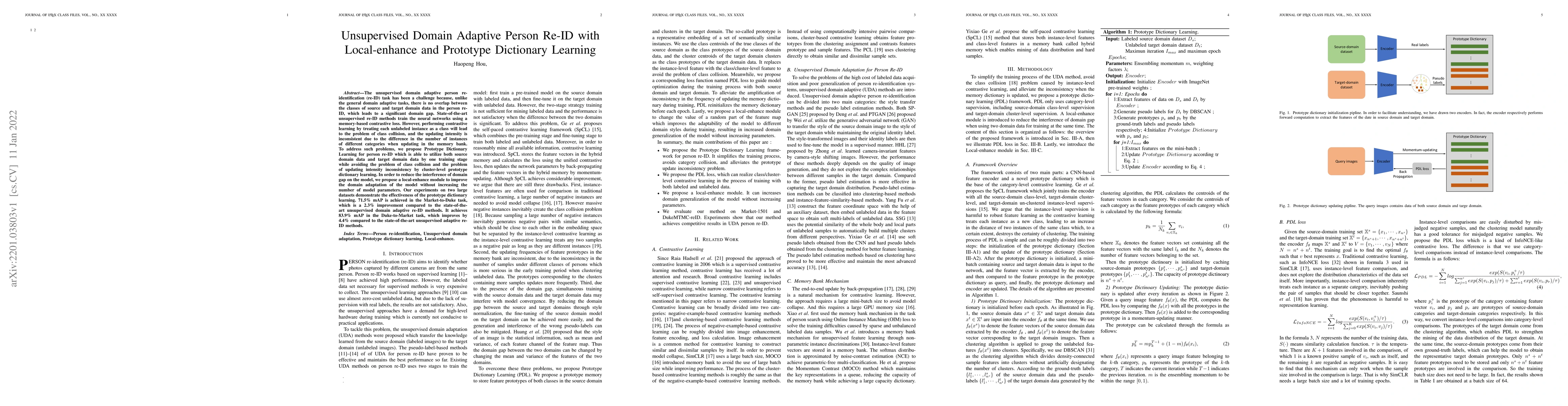 This paper proposes an unsupervised domain adaptive person re-ID method using Prototype Dictionary Learning and a local-enhance module to address class collision and updating intensity issues. The approach achieves notable improvements over state-of-the-art methods, with a 2.3% and 4.4% increase in mAP for the Market-to-Duke and Duke-to-Market tasks, respectively.