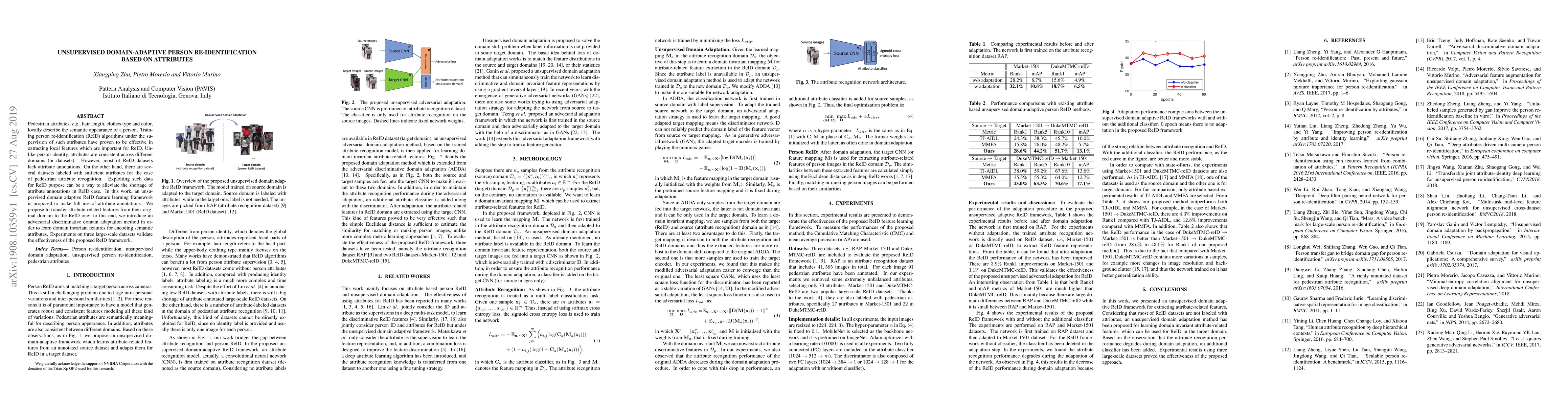 This paper proposes an unsupervised domain adaptive framework for person re-identification (ReID) that leverages pedestrian attributes to extract domain-invariant features. It employs adversarial discriminative domain adaptation to transfer attribute-related features, thereby addressing the lack of attribute annotations in ReID datasets.
