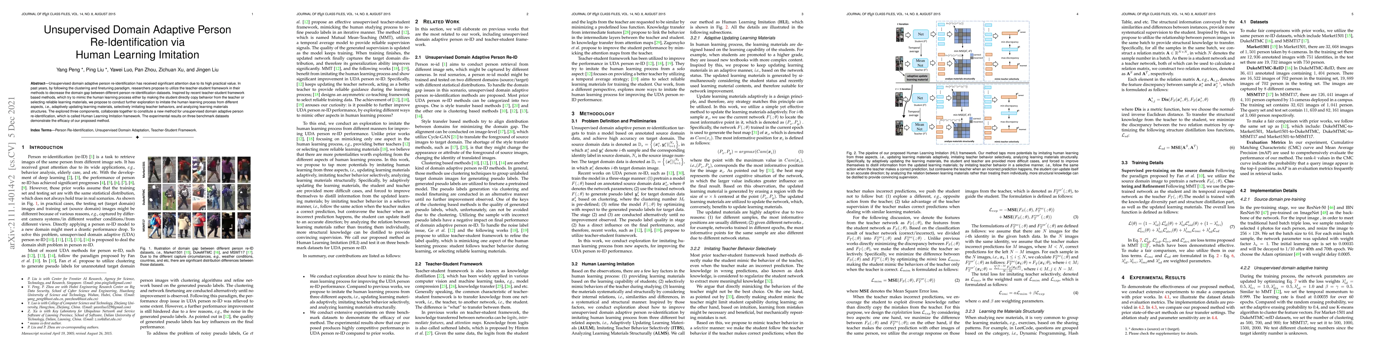 The paper proposes a Human Learning Imitation framework for unsupervised domain adaptive person re-identification, inspired by mimicking the human learning process through adaptive updates, selective imitation, and analysis of learning material structures. Experimental results on three datasets show the method's effectiveness.