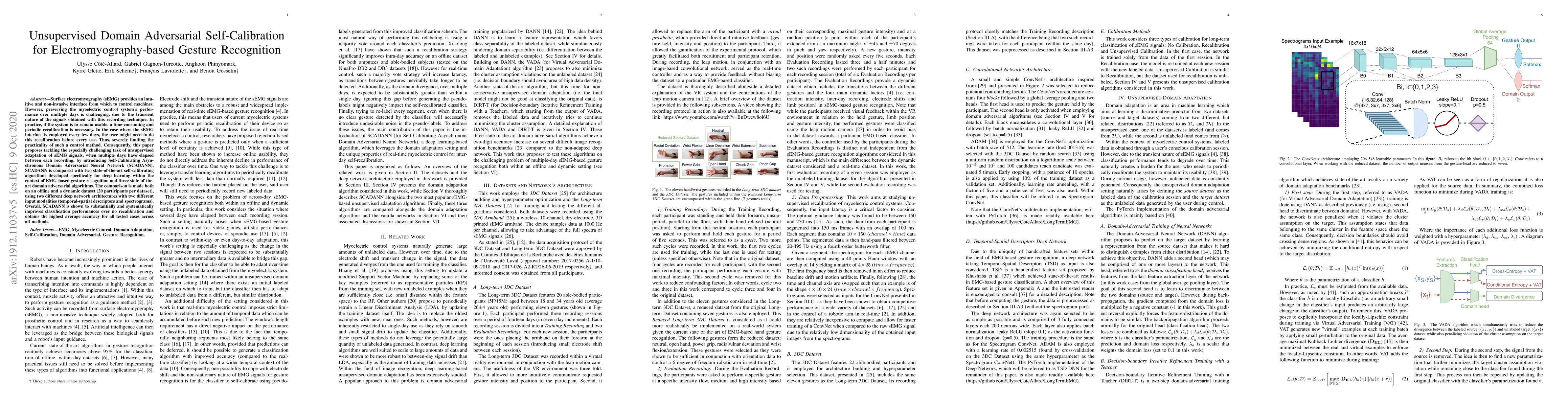 This paper introduces Self-Calibrating Asynchronous Domain Adversarial Neural Network (SCADANN) to address the challenge of unsupervised adaptation for electromyographic-based gesture recognition over multiple days. SCADANN significantly improves classification performance compared to state-of-the-art self-calibrating and domain adversarial algorithms, demonstrating the highest average accuracy across various deep network architectures and input modalities.