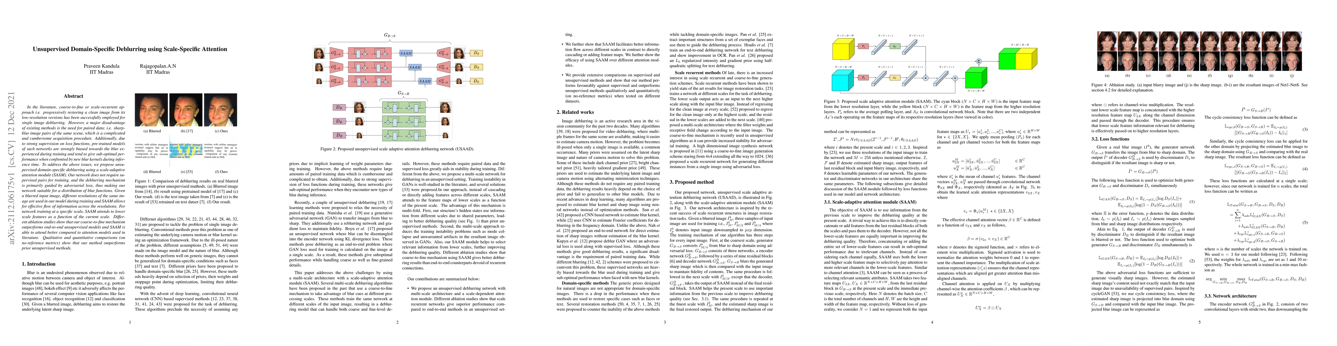 This paper proposes an unsupervised domain-specific deblurring method using a scale-adaptive attention module (SAAM) that does not require paired training data. The method outperforms existing end-to-end unsupervised models and achieves better performance on both qualitative and quantitative metrics.