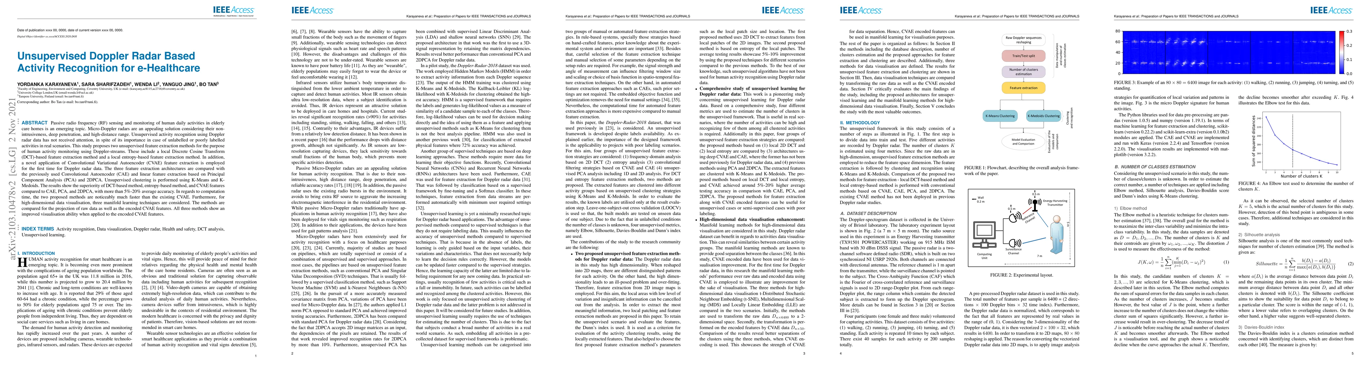 This paper proposes unsupervised feature extraction methods for Doppler radar-based activity recognition in elderly care, including DCT, entropy-based, and CVAE techniques. The results demonstrate superior accuracy and faster computation compared to existing methods, with enhanced data visualization using manifold learning.