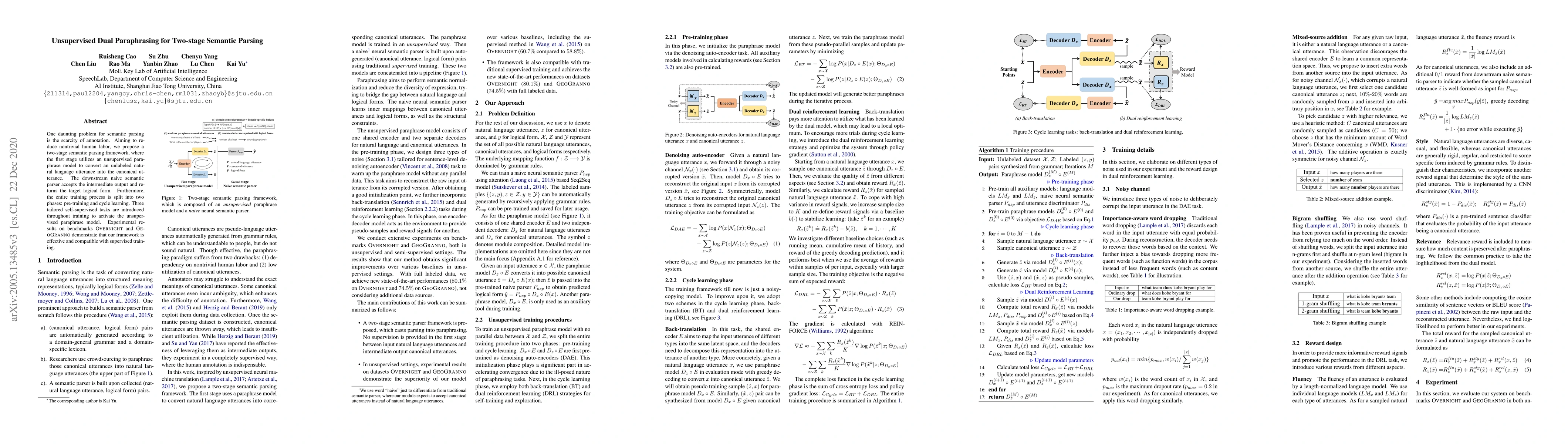 This paper proposes a two-stage semantic parsing framework that uses an unsupervised paraphrase model to convert natural language to canonical form, reducing annotation labor. The framework includes pre-training and cycle learning with self-supervised tasks, and experiments show its effectiveness on benchmarks.