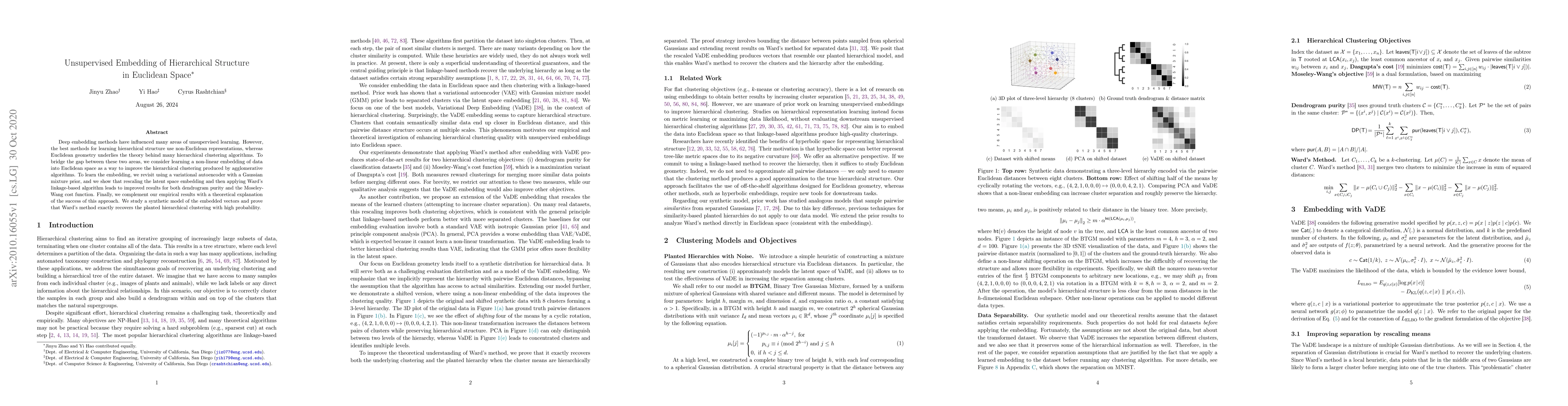 This paper proposes a method to embed hierarchical structures into Euclidean space using a variational autoencoder with a Gaussian mixture prior, aiming to enhance agglomerative clustering algorithms. The approach rescales the latent space and applies Ward's linkage, showing improved dendrogram purity and Moseley-Wang cost function, supported by theoretical proof of exact recovery of hierarchical clustering in synthetic models.
