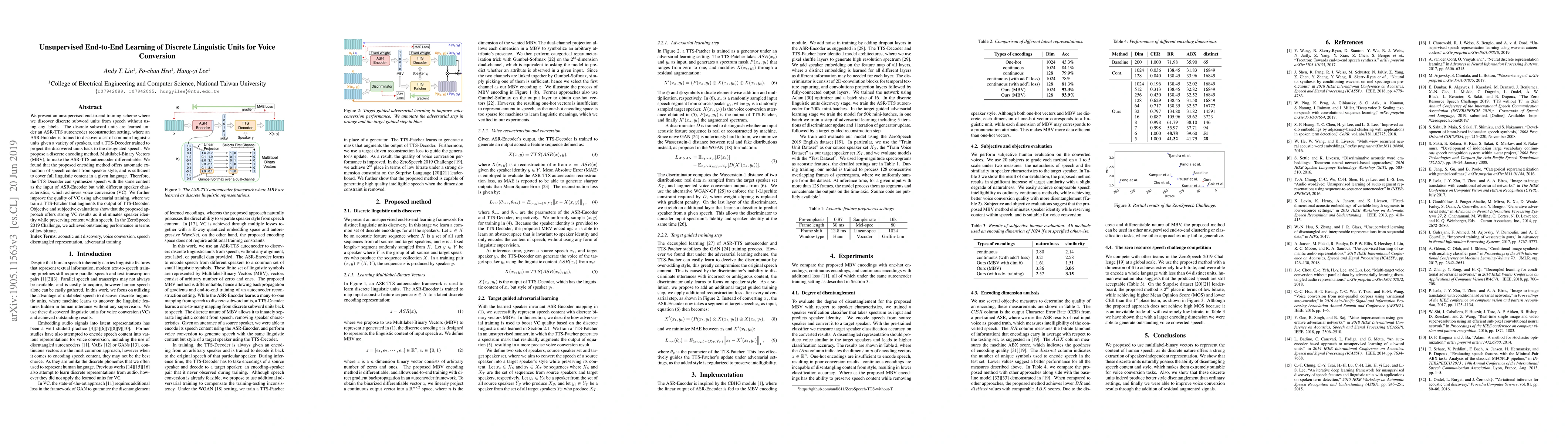 We present an unsupervised end-to-end training scheme where we discover discrete subword units from speech without using any labels. The discrete subword units are learned under an ASR-TTS autoencoder reconstruction setting, where an ASR-Encoder is trained to discover a set of common linguistic units given a variety of speakers, and a TTS-Decoder trained to project the discovered units back to the designated speech. We propose a discrete encoding method, Multilabel-Binary Vectors (MBV), to make the ASR-TTS autoencoder differentiable. We found that the proposed encoding method offers automatic extraction of speech content from speaker style, and is sufficient to cover full linguistic content in a given language. Therefore, the TTS-Decoder can synthesize speech with the same content as the input of ASR-Encoder but with different speaker characteristics, which achieves voice conversion (VC). We further improve the quality of VC using adversarial training, where we train a TTS-Patcher that augments the output of TTS-Decoder. Objective and subjective evaluations show that the proposed approach offers strong VC results as it eliminates speaker identity while preserving content within speech. In the ZeroSpeech 2019 Challenge, we achieved outstanding performance in terms of low bitrate.