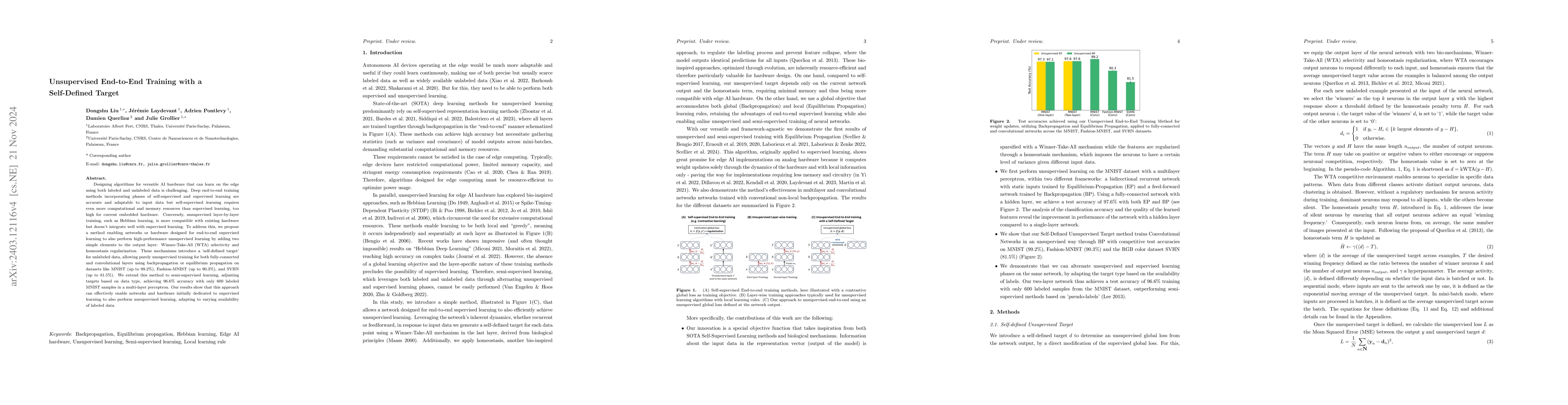 This paper proposes a novel 'self-defined target' method for unsupervised end-to-end training that combines Winner-Take-All selectivity and biologically inspired homeostasis, achieving 97.6% accuracy on MNIST. It also demonstrates improved performance with semi-supervised learning, reaching 96.6% accuracy using only 600 labeled samples.
