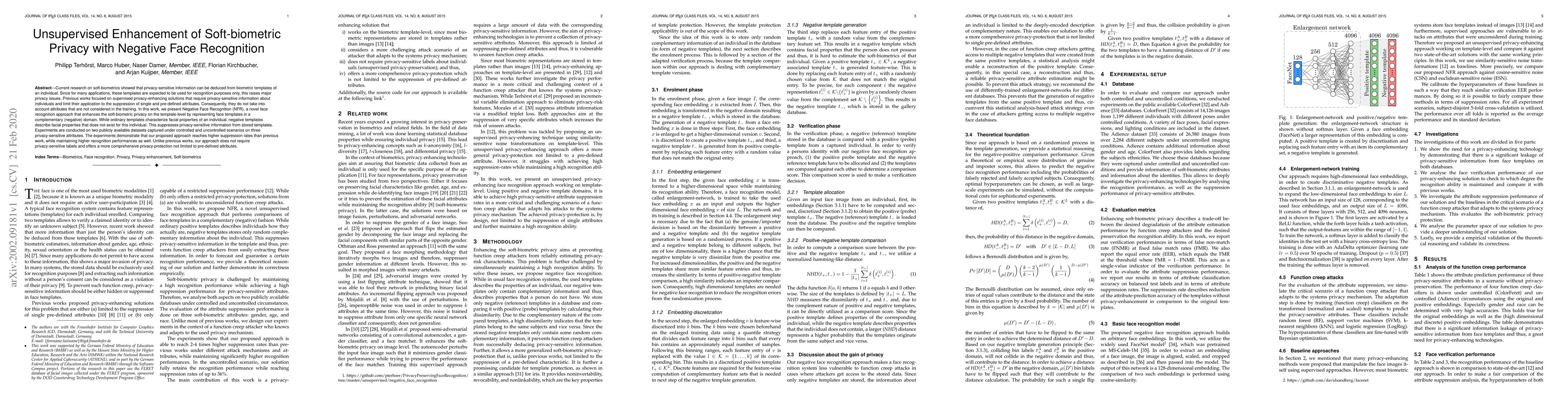 This paper introduces Negative Face Recognition (NFR), an unsupervised method to enhance soft-biometric privacy by generating complementary (negative) face templates that suppress privacy-sensitive information. Unlike supervised methods, NFR does not require privacy-sensitive labels and provides comprehensive protection across all attributes, achieving higher suppression rates and maintaining recognition performance.