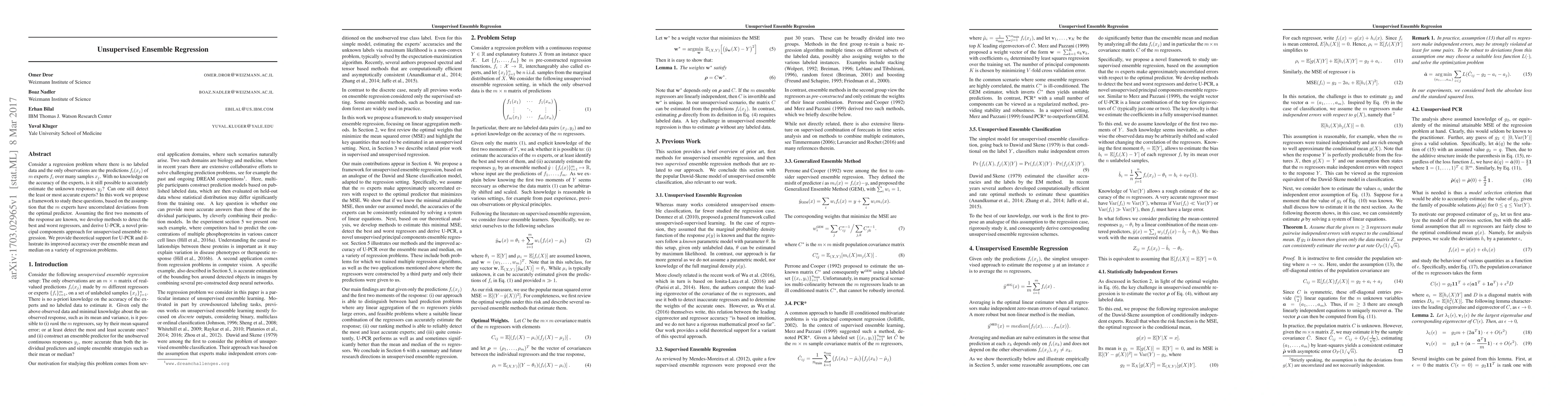 This paper proposes a novel approach for unsupervised ensemble regression that detects the best and worst experts based on their deviations from an optimal predictor. It shows improved accuracy over traditional methods using U-PCR, a principal components-based approach.