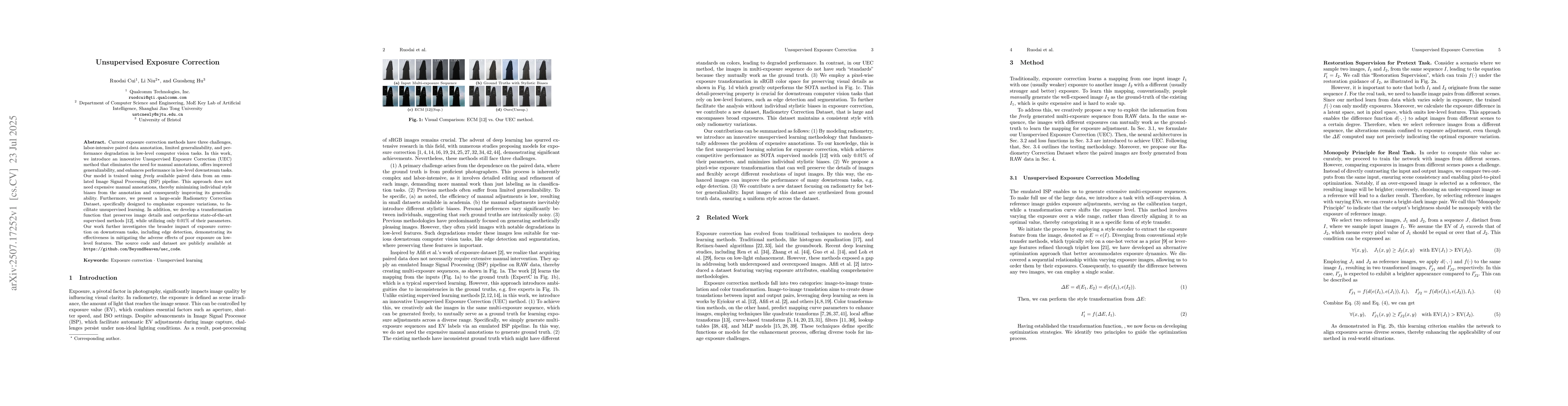 Current exposure correction methods have three challenges, labor-intensive paired data annotation, limited generalizability, and performance degradation in low-level computer vision tasks. In this work, we introduce an innovative Unsupervised Exposure Correction (UEC) method that eliminates the need for manual annotations, offers improved generalizability, and enhances performance in low-level downstream tasks. Our model is trained using freely available paired data from an emulated Image Signal Processing (ISP) pipeline. This approach does not need expensive manual annotations, thereby minimizing individual style biases from the annotation and consequently improving its generalizability. Furthermore, we present a large-scale Radiometry Correction Dataset, specifically designed to emphasize exposure variations, to facilitate unsupervised learning. In addition, we develop a transformation function that preserves image details and outperforms state-of-the-art supervised methods [12], while utilizing only 0.01% of their parameters. Our work further investigates the broader impact of exposure correction on downstream tasks, including edge detection, demonstrating its effectiveness in mitigating the adverse effects of poor exposure on low-level features. The source code and dataset are publicly available at https://github.com/BeyondHeaven/uec_code.