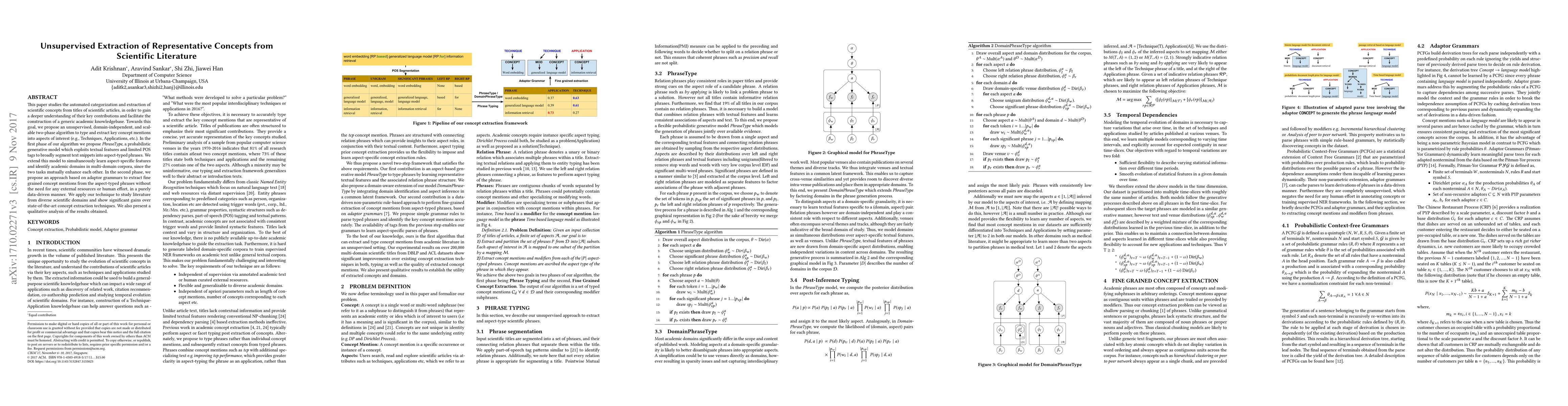 This paper studies the automated categorization and extraction of scientific concepts from titles of scientific articles, in order to gain a deeper understanding of their key contributions and facilitate the construction of a generic academic knowledgebase. Towards this goal, we propose an unsupervised, domain-independent, and scalable two-phase algorithm to type and extract key concept mentions into aspects of interest (e.g., Techniques, Applications, etc.). In the first phase of our algorithm we propose PhraseType, a probabilistic generative model which exploits textual features and limited POS tags to broadly segment text snippets into aspect-typed phrases. We extend this model to simultaneously learn aspect-specific features and identify academic domains in multi-domain corpora, since the two tasks mutually enhance each other. In the second phase, we propose an approach based on adaptor grammars to extract fine grained concept mentions from the aspect-typed phrases without the need for any external resources or human effort, in a purely data-driven manner. We apply our technique to study literature from diverse scientific domains and show significant gains over state-of-the-art concept extraction techniques. We also present a qualitative analysis of the results obtained.