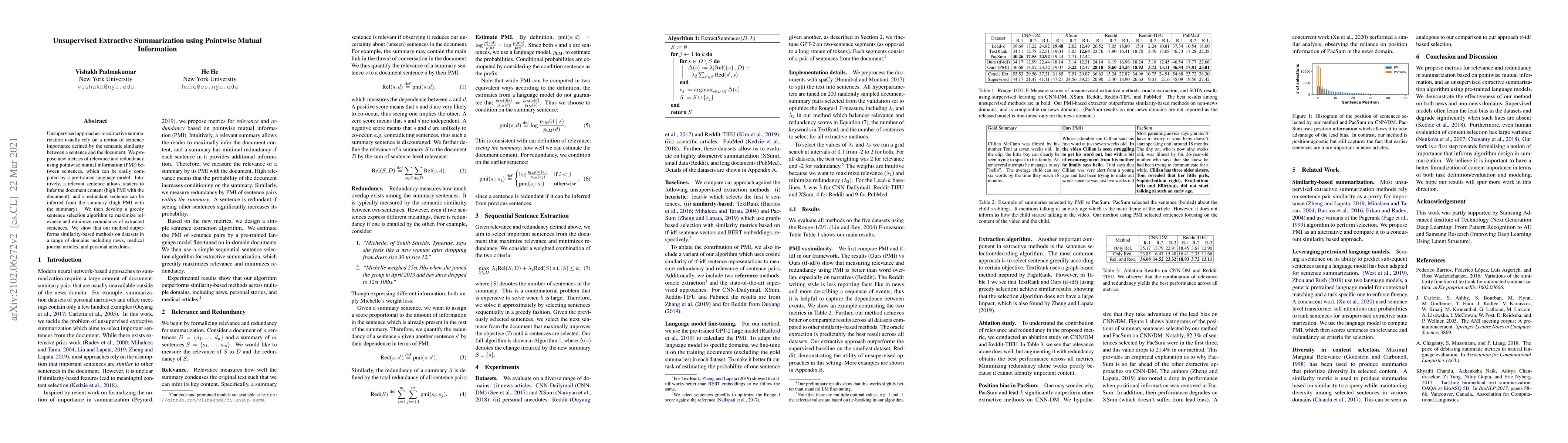 This research introduces an unsupervised extractive summarization method utilizing pointwise mutual information (PMI) to measure sentence relevance and redundancy, outperforming traditional similarity-based approaches across various domains. The proposed algorithm selects sentences that maximize relevance to the document and minimize redundancy within the summary.