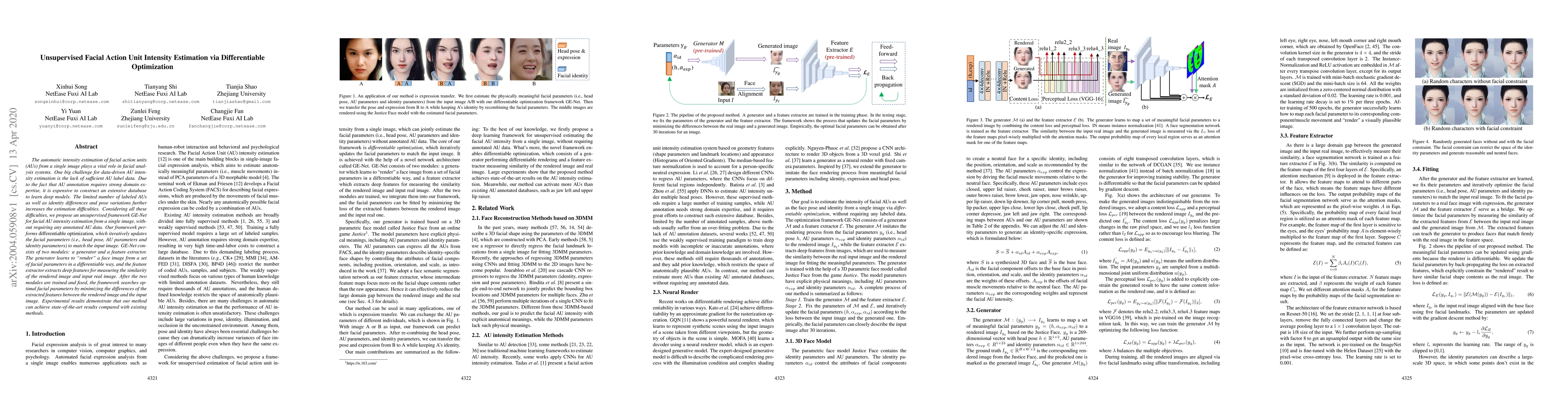 This paper proposes an unsupervised framework, GE-Net, for estimating facial action unit intensities from a single image without requiring labeled AU data. It uses differentiable optimization to iteratively refine facial parameters to match input images, achieving state-of-the-art results.