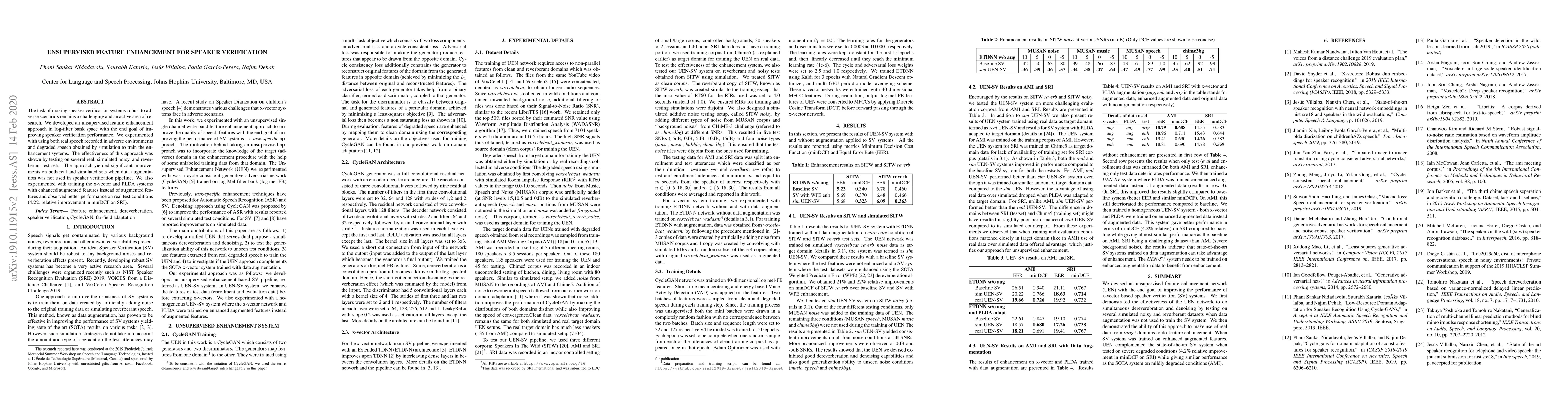The task of making speaker verification systems robust to adverse scenarios remain a challenging and an active area of research. We developed an unsupervised feature enhancement approach in log-filter bank domain with the end goal of improving speaker verification performance. We experimented with using both real speech recorded in adverse environments and degraded speech obtained by simulation to train the enhancement systems. The effectiveness of the approach was shown by testing on several real, simulated noisy, and reverberant test sets. The approach yielded significant improvements on both real and simulated sets when data augmentation was not used in speaker verification pipeline or augmentation was used only during x-vector training. When data augmentation was used for x-vector and PLDA training, our enhancement approach yielded slight improvements.