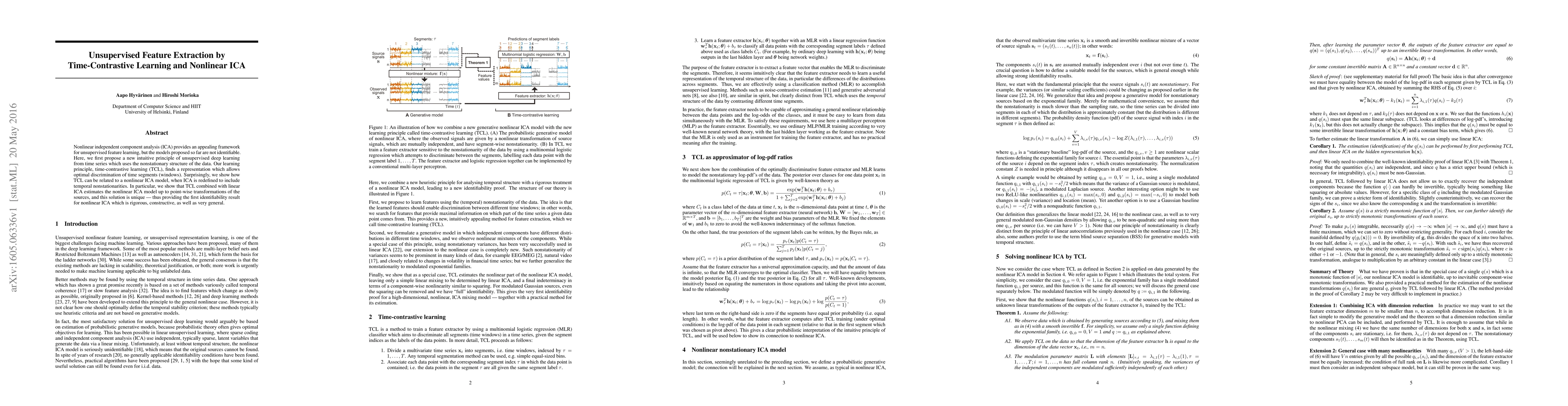 This paper proposes time-contrastive learning (TCL) as a method for unsupervised feature extraction from time series data, leveraging the nonstationary structure. It demonstrates that TCL combined with linear ICA can estimate nonlinear ICA models uniquely, providing a rigorous, constructive, and general identifiability result for nonlinear ICA.