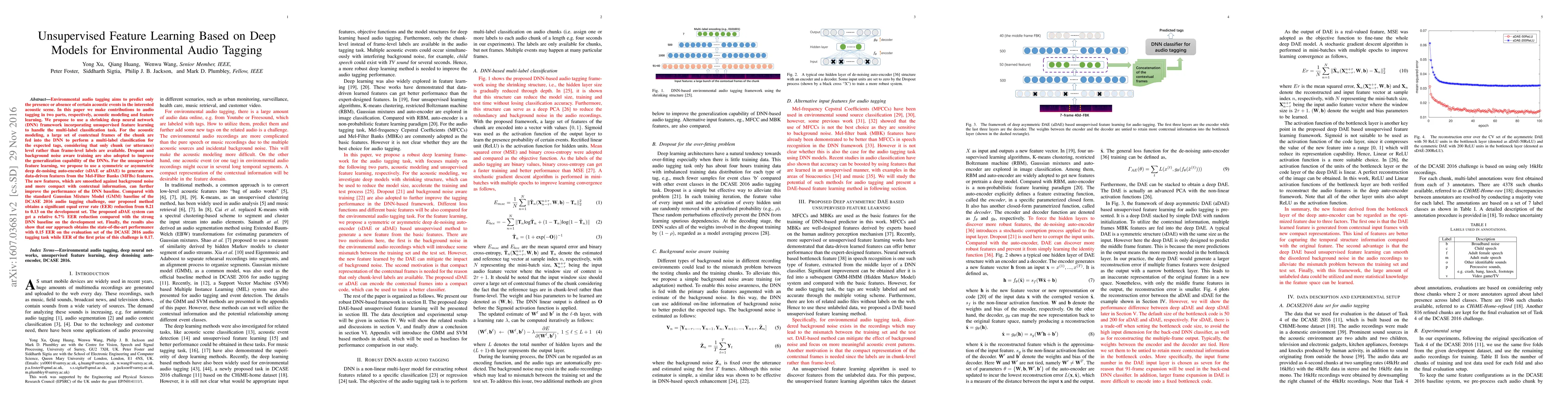 This paper proposes a deep neural network framework with unsupervised feature learning for environmental audio tagging, achieving significant improvements in multi-label classification. The method uses a shrinking DNN with dropout and noise-aware training, and a deep de-noising auto-encoder for feature extraction, resulting in state-of-the-art performance with a 0.15 equal error rate on the DCASE 2016 evaluation set.