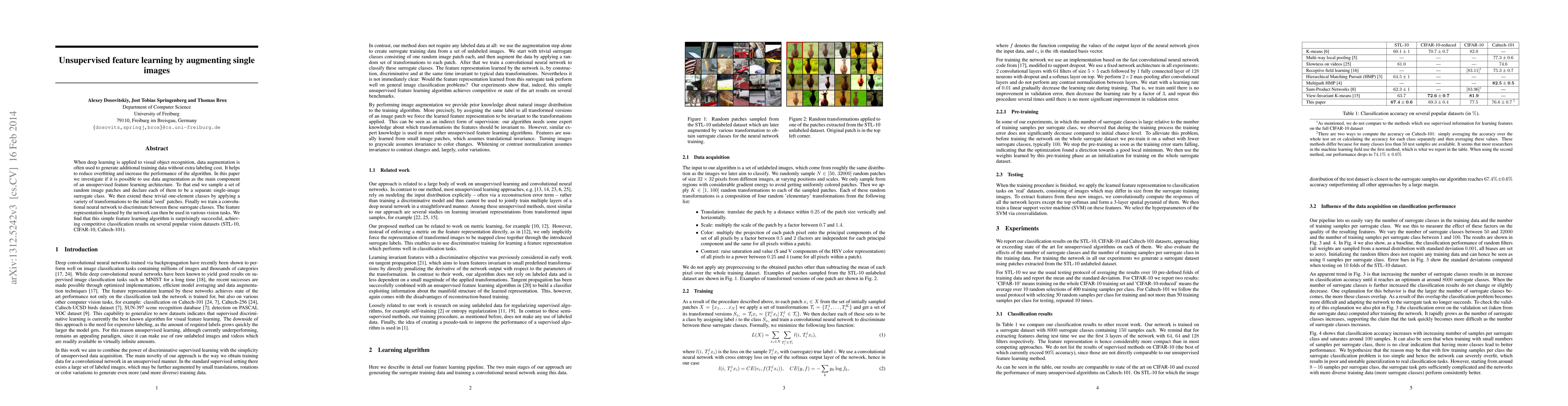 When deep learning is applied to visual object recognition, data augmentation is often used to generate additional training data without extra labeling cost. It helps to reduce overfitting and increase the performance of the algorithm. In this paper we investigate if it is possible to use data augmentation as the main component of an unsupervised feature learning architecture. To that end we sample a set of random image patches and declare each of them to be a separate single-image surrogate class. We then extend these trivial one-element classes by applying a variety of transformations to the initial 'seed' patches. Finally we train a convolutional neural network to discriminate between these surrogate classes. The feature representation learned by the network can then be used in various vision tasks. We find that this simple feature learning algorithm is surprisingly successful, achieving competitive classification results on several popular vision datasets (STL-10, CIFAR-10, Caltech-101).