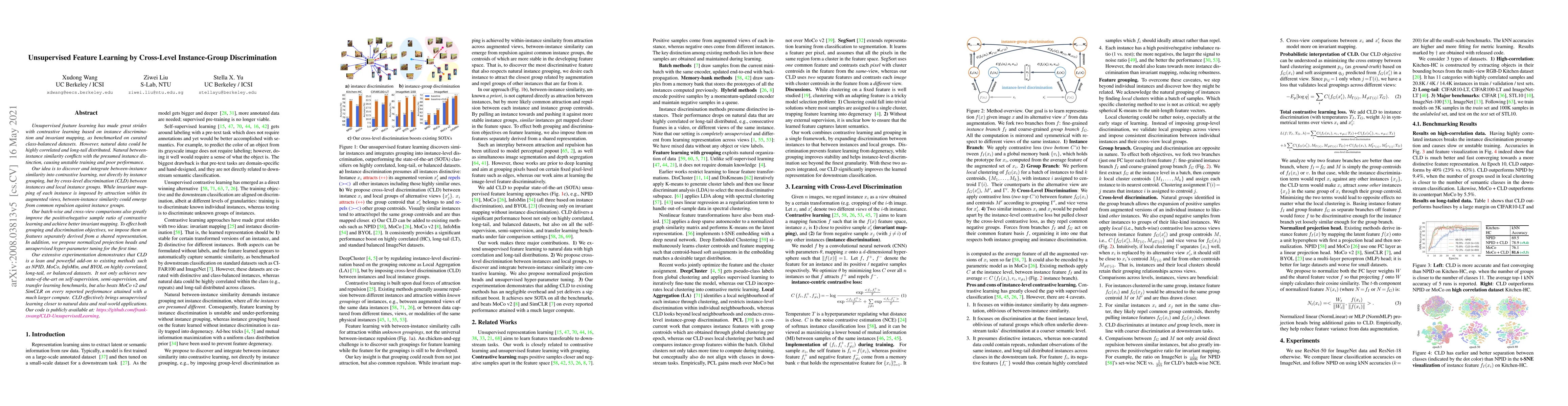 Unsupervised feature learning has made great strides with contrastive learning based on instance discrimination and invariant mapping, as benchmarked on curated class-balanced datasets. However, natural data could be highly correlated and long-tail distributed. Natural between-instance similarity conflicts with the presumed instance distinction, causing unstable training and poor performance. Our idea is to discover and integrate between-instance similarity into contrastive learning, not directly by instance grouping, but by cross-level discrimination (CLD) between instances and local instance groups. While invariant mapping of each instance is imposed by attraction within its augmented views, between-instance similarity could emerge from common repulsion against instance groups. Our batch-wise and cross-view comparisons also greatly improve the positive/negative sample ratio of contrastive learning and achieve better invariant mapping. To effect both grouping and discrimination objectives, we impose them on features separately derived from a shared representation. In addition, we propose normalized projection heads and unsupervised hyper-parameter tuning for the first time. Our extensive experimentation demonstrates that CLD is a lean and powerful add-on to existing methods such as NPID, MoCo, InfoMin, and BYOL on highly correlated, long-tail, or balanced datasets. It not only achieves new state-of-the-art on self-supervision, semi-supervision, and transfer learning benchmarks, but also beats MoCo v2 and SimCLR on every reported performance attained with a much larger compute. CLD effectively brings unsupervised learning closer to natural data and real-world applications. Our code is publicly available at: https://github.com/frank-xwang/CLD-UnsupervisedLearning.