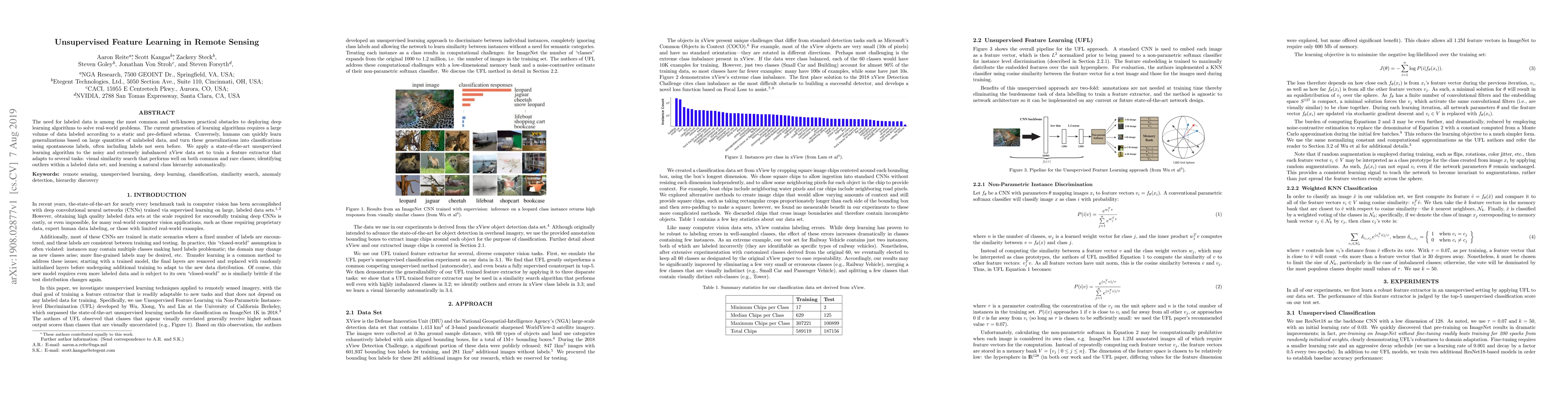 The need for labeled data is among the most common and well-known practical obstacles to deploying deep learning algorithms to solve real-world problems. The current generation of learning algorithms requires a large volume of data labeled according to a static and pre-defined schema. Conversely, humans can quickly learn generalizations based on large quantities of unlabeled data, and turn these generalizations into classifications using spontaneous labels, often including labels not seen before. We apply a state-of-the-art unsupervised learning algorithm to the noisy and extremely imbalanced xView data set to train a feature extractor that adapts to several tasks: visual similarity search that performs well on both common and rare classes; identifying outliers within a labeled data set; and learning a natural class hierarchy automatically.