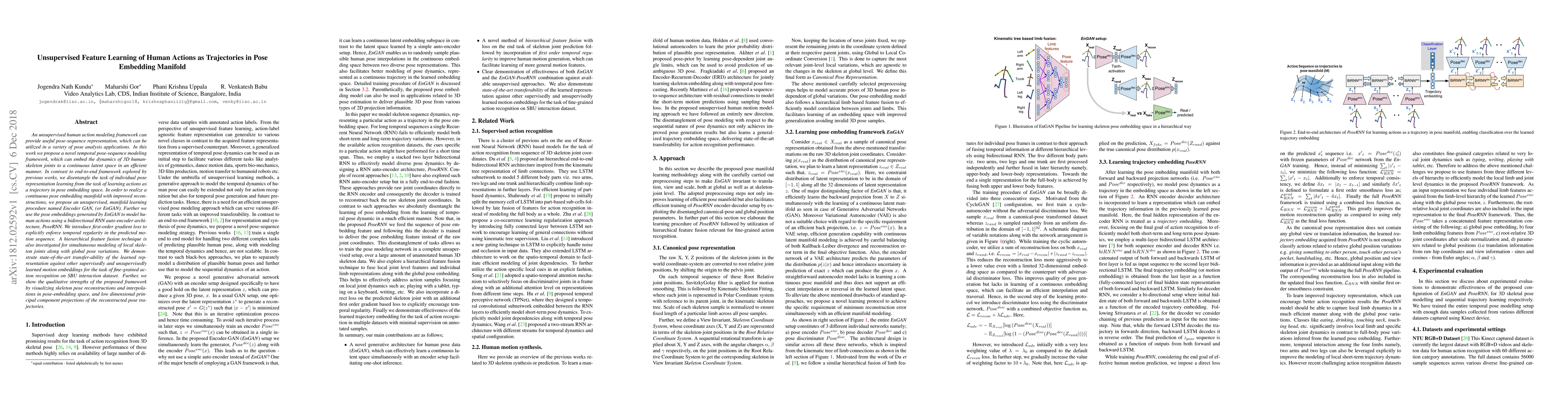 An unsupervised human action modeling framework can provide useful pose-sequence representation, which can be utilized in a variety of pose analysis applications. In this work we propose a novel temporal pose-sequence modeling framework, which can embed the dynamics of 3D human-skeleton joints to a continuous latent space in an efficient manner. In contrast to end-to-end framework explored by previous works, we disentangle the task of individual pose representation learning from the task of learning actions as a trajectory in pose embedding space. In order to realize a continuous pose embedding manifold with improved reconstructions, we propose an unsupervised, manifold learning procedure named Encoder GAN, (or EnGAN). Further, we use the pose embeddings generated by EnGAN to model human actions using a bidirectional RNN auto-encoder architecture, PoseRNN. We introduce first-order gradient loss to explicitly enforce temporal regularity in the predicted motion sequence. A hierarchical feature fusion technique is also investigated for simultaneous modeling of local skeleton joints along with global pose variations. We demonstrate state-of-the-art transfer-ability of the learned representation against other supervisedly and unsupervisedly learned motion embeddings for the task of fine-grained action recognition on SBU interaction dataset. Further, we show the qualitative strengths of the proposed framework by visualizing skeleton pose reconstructions and interpolations in pose-embedding space, and low dimensional principal component projections of the reconstructed pose trajectories.