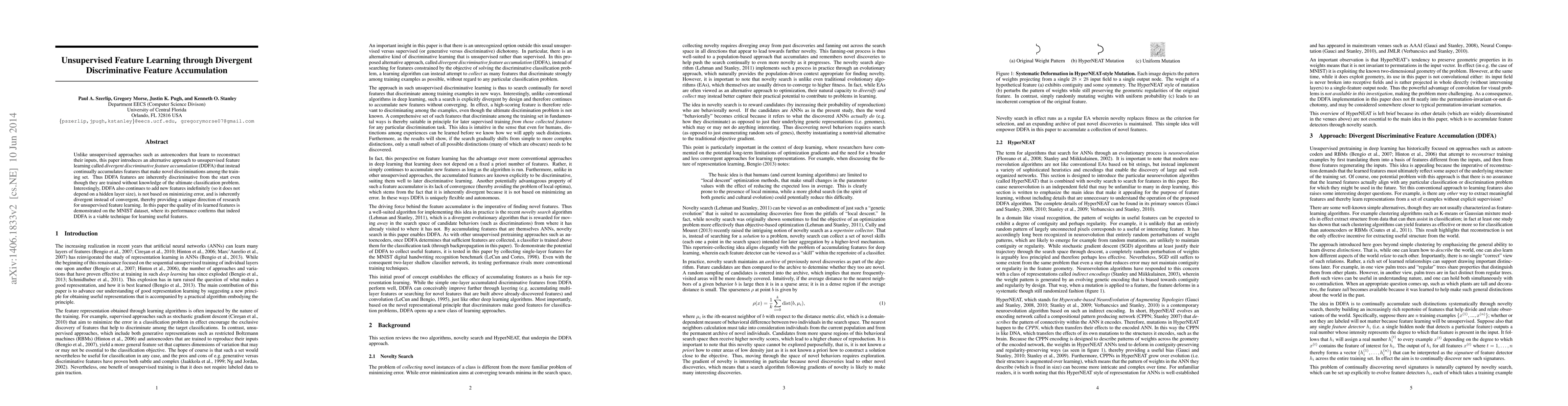 This paper proposes divergent discriminative feature accumulation (DDFA) as an alternative to unsupervised feature learning, focusing on accumulating features that enable novel discriminations. Unlike autoencoders, DDFA features are inherently discriminative without classification knowledge, and it continues to add new features indefinitely, demonstrating its effectiveness on the MNIST dataset.