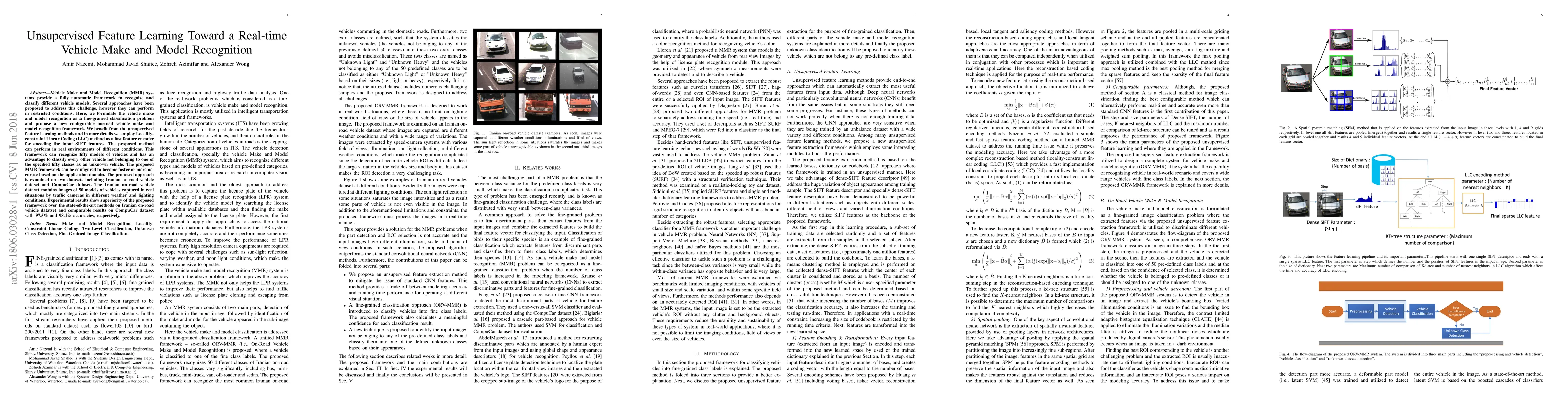 This paper proposes an unsupervised feature learning framework for real-time vehicle make and model recognition, utilizing Locality constraint Linear Coding (LLC) for encoding SIFT features. The framework can recognize 50 vehicle models and classify unknown vehicles, achieving 97.5% accuracy on an Iranian dataset and 98.4% on the CompuCar dataset.