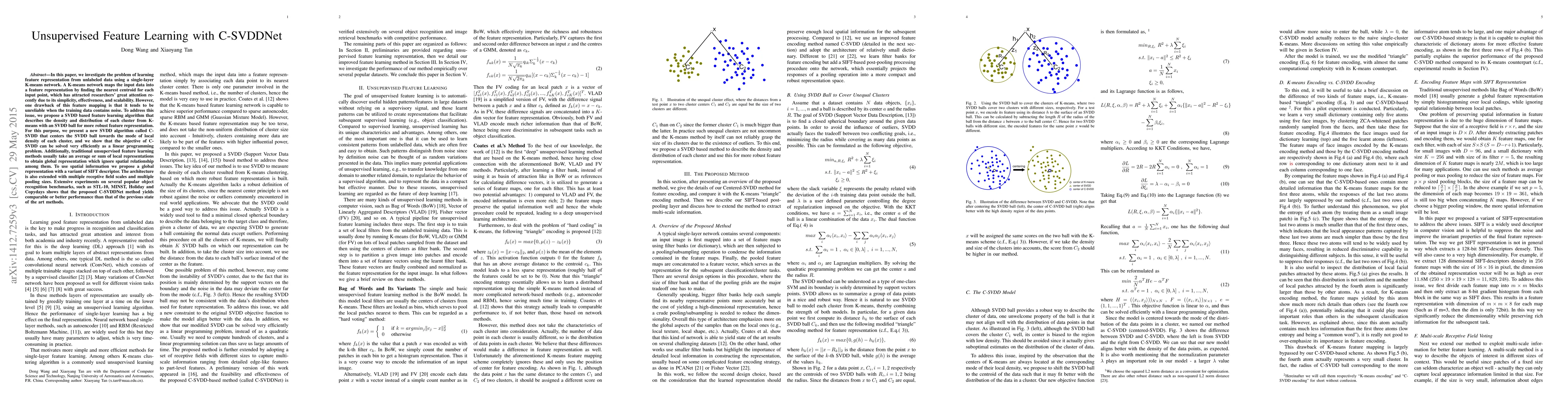 Researchers propose a new method called C-SVDDNet for learning feature representations from unlabeled data, showing improved performance on object recognition benchmarks compared to existing methods.
