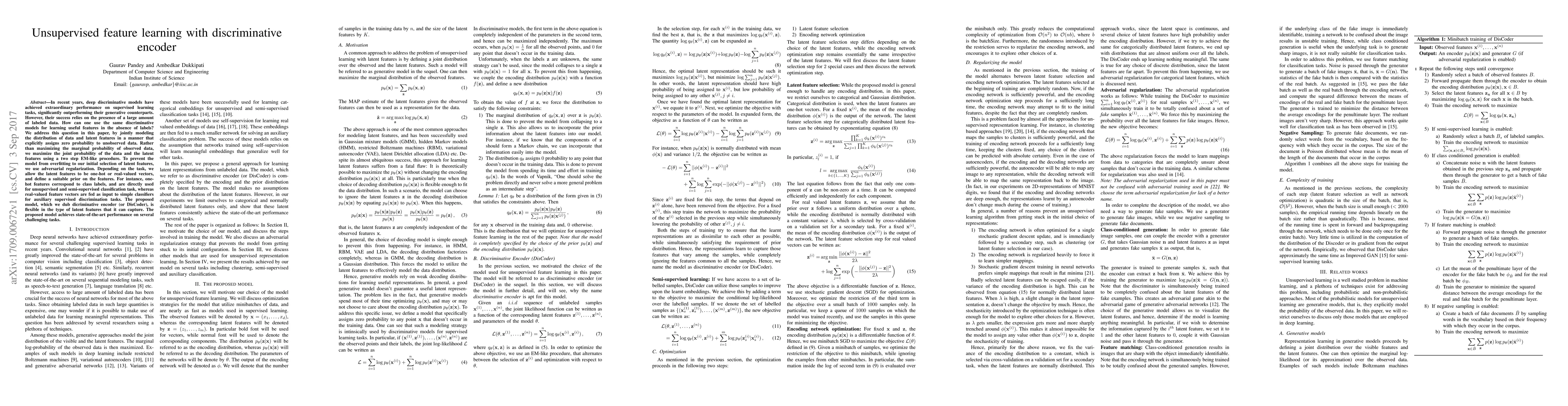 This paper proposes a discriminative encoder (DisCoder) to learn useful features from unlabeled data by jointly modeling data distribution and latent features, maximizing their joint probability through an EM-like procedure. It employs adversarial regularization to prevent overfitting and achieves state-of-the-art performance on various tasks.