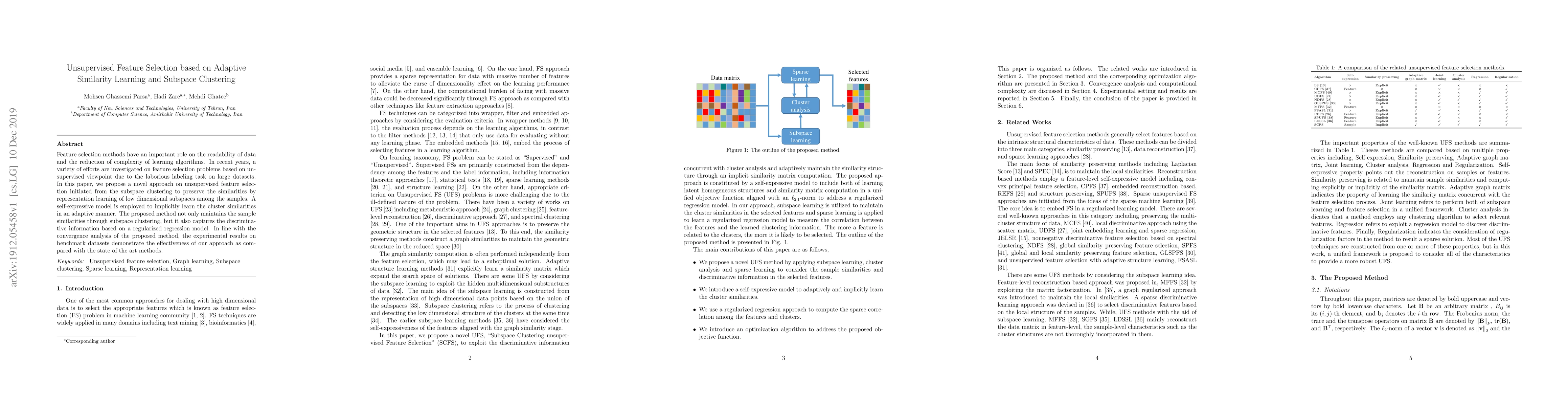 This paper proposes an unsupervised feature selection method based on adaptive similarity learning and subspace clustering, employing a self-expressive model to implicitly learn cluster similarities and a regularized regression model to capture discriminative information, demonstrating superior performance on benchmark datasets.