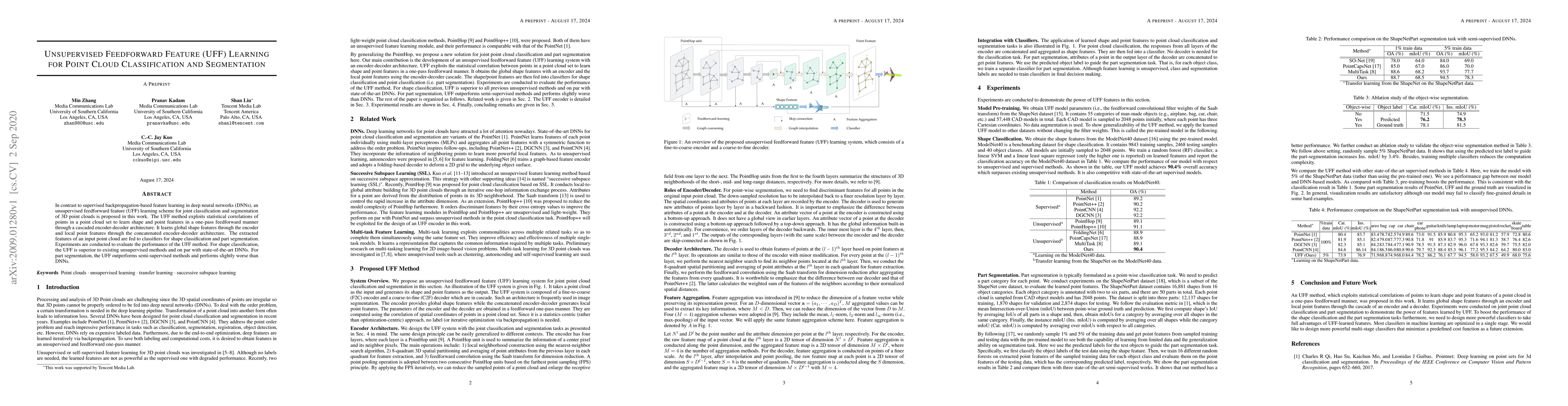 This paper proposes an unsupervised feedforward feature (UFF) learning method for 3D point cloud classification and segmentation. The UFF method leverages statistical correlations in point clouds to learn shape and point features through a cascaded encoder-decoder architecture, outperforming existing unsupervised methods in shape classification and segmenting parts better than semi-supervised approaches.
