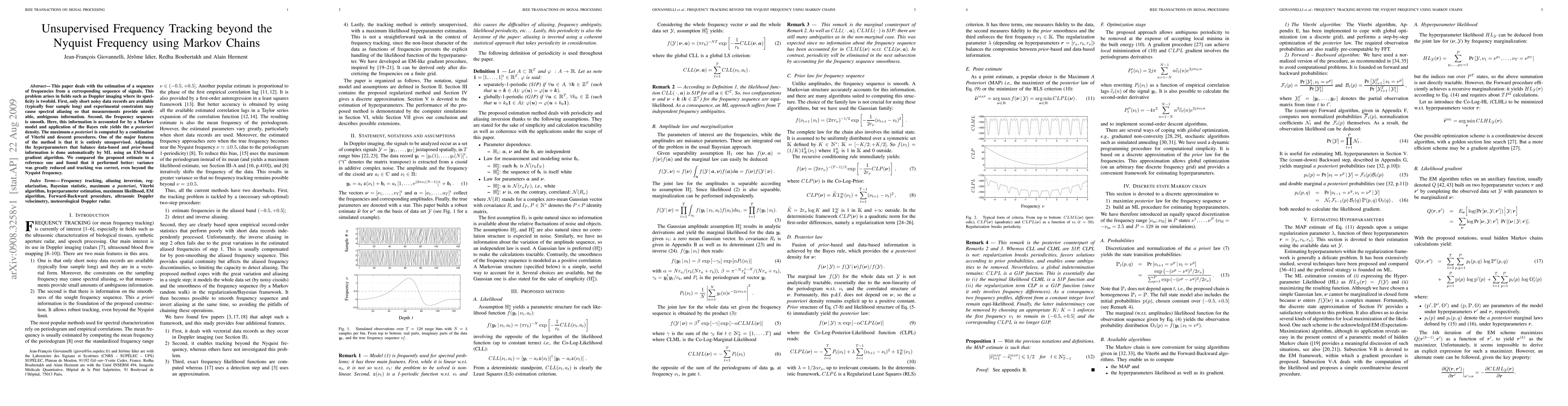 This paper deals with the estimation of a sequence of frequencies from a corresponding sequence of signals. This problem arises in fields such as Doppler imaging where its specificity is twofold. First, only short noisy data records are available (typically four sample long) and experimental constraints may cause spectral aliasing so that measurements provide unreliable, ambiguous information. Second, the frequency sequence is smooth. Here, this information is accounted for by a Markov model and application of the Bayes rule yields the a posteriori density. The maximum a postariori is computed by a combination of Viterbi and descent procedures. One of the major features of the method is that it is entirely unsupervised. Adjusting the hyperparameters that balance data-based and prior-based information is done automatically by ML using an EM-based gradient algorithm. We compared the proposed estimate to a reference one and found that it performed better: variance was greatly reduced and tracking was correct, even beyond the Nyquist frequency.