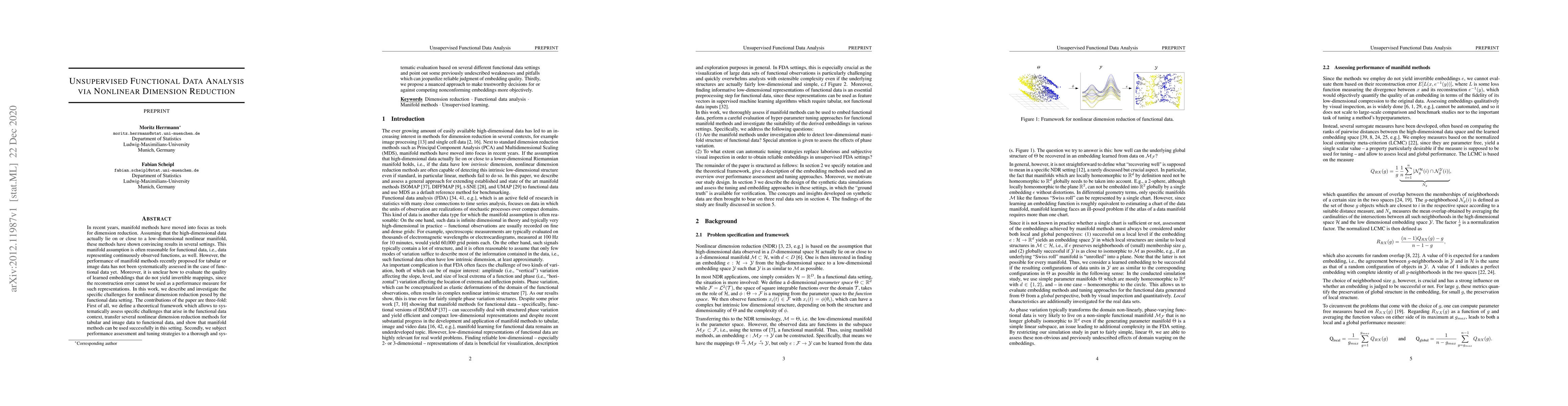 In recent years, manifold methods have moved into focus as tools for dimension reduction. Assuming that the high-dimensional data actually lie on or close to a low-dimensional nonlinear manifold, these methods have shown convincing results in several settings. This manifold assumption is often reasonable for functional data, i.e., data representing continuously observed functions, as well. However, the performance of manifold methods recently proposed for tabular or image data has not been systematically assessed in the case of functional data yet. Moreover, it is unclear how to evaluate the quality of learned embeddings that do not yield invertible mappings, since the reconstruction error cannot be used as a performance measure for such representations. In this work, we describe and investigate the specific challenges for nonlinear dimension reduction posed by the functional data setting. The contributions of the paper are three-fold: First of all, we define a theoretical framework which allows to systematically assess specific challenges that arise in the functional data context, transfer several nonlinear dimension reduction methods for tabular and image data to functional data, and show that manifold methods can be used successfully in this setting. Secondly, we subject performance assessment and tuning strategies to a thorough and systematic evaluation based on several different functional data settings and point out some previously undescribed weaknesses and pitfalls which can jeopardize reliable judgment of embedding quality. Thirdly, we propose a nuanced approach to make trustworthy decisions for or against competing nonconforming embeddings more objectively.