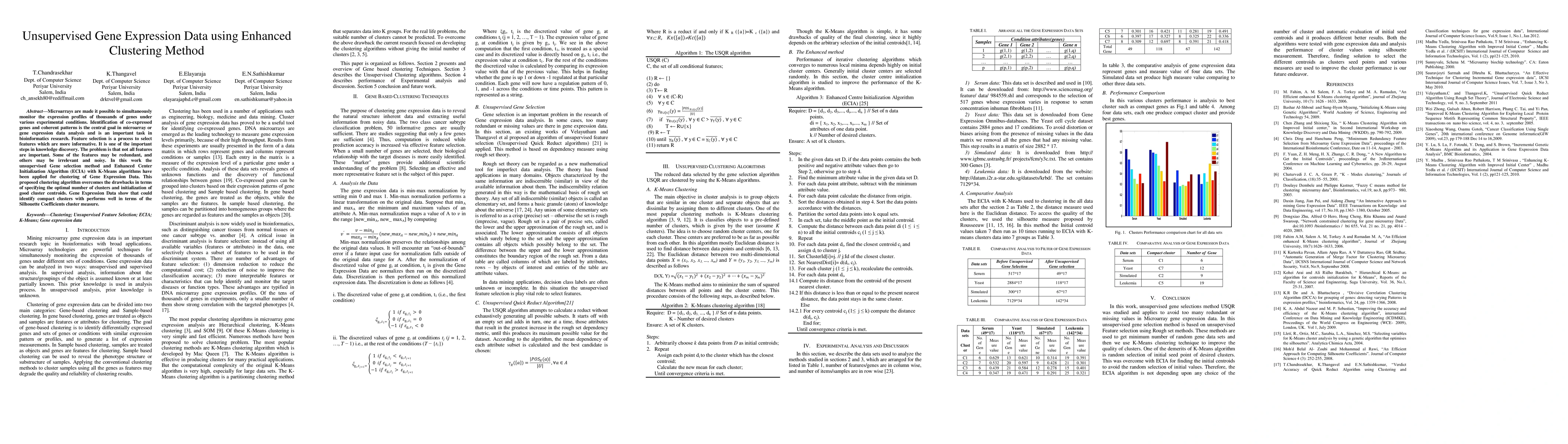 Microarrays are made it possible to simultaneously monitor the expression profiles of thousands of genes under various experimental conditions. Identification of co-expressed genes and coherent patterns is the central goal in microarray or gene expression data analysis and is an important task in bioinformatics research. Feature selection is a process to select features which are more informative. It is one of the important steps in knowledge discovery. The problem is that not all features are important. Some of the features may be redundant, and others may be irrelevant and noisy. In this work the unsupervised Gene selection method and Enhanced Center Initialization Algorithm (ECIA) with K-Means algorithms have been applied for clustering of Gene Expression Data. This proposed clustering algorithm overcomes the drawbacks in terms of specifying the optimal number of clusters and initialization of good cluster centroids. Gene Expression Data show that could identify compact clusters with performs well in terms of the Silhouette Coefficients cluster measure.