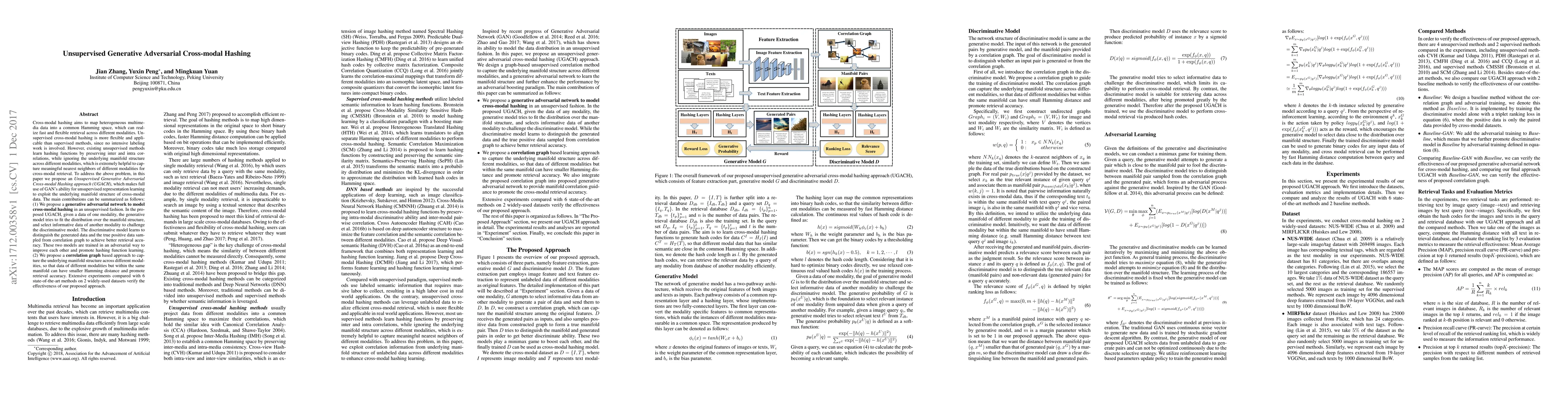 This paper introduces an Unsupervised Generative Adversarial Cross-modal Hashing (UGACH) method that leverages GANs to capture the manifold structure across different modalities, enhancing cross-modal retrieval accuracy by modeling data distributions and employing a discriminative model to distinguish generated data from true positives in an adversarial training process. Experiments demonstrate superior performance compared to six state-of-the-art methods.