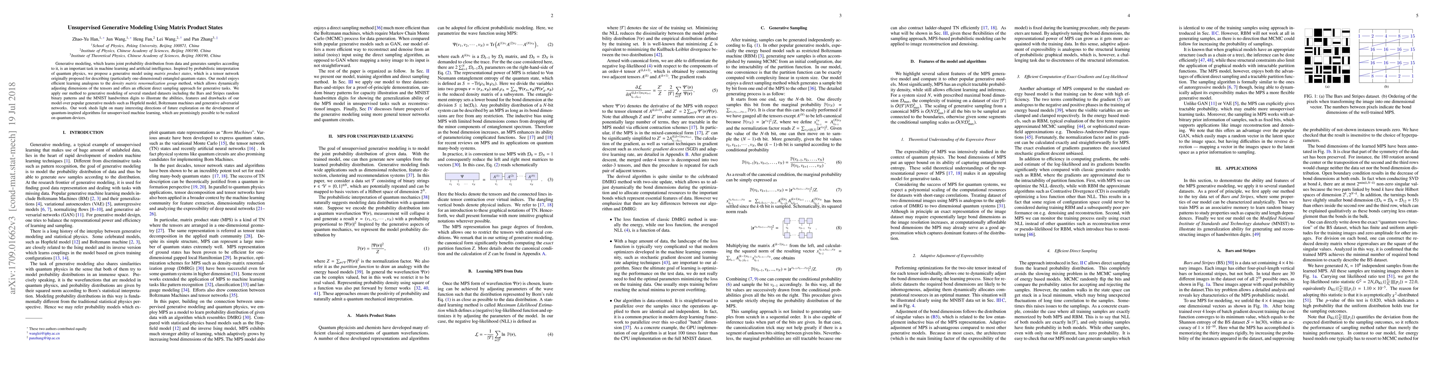 This paper proposes a generative model using matrix product states, inspired by quantum physics, for efficient unsupervised learning and sampling. The model is applied to various datasets to compare its performance against traditional generative models, highlighting potential for quantum-inspired machine learning advancements.