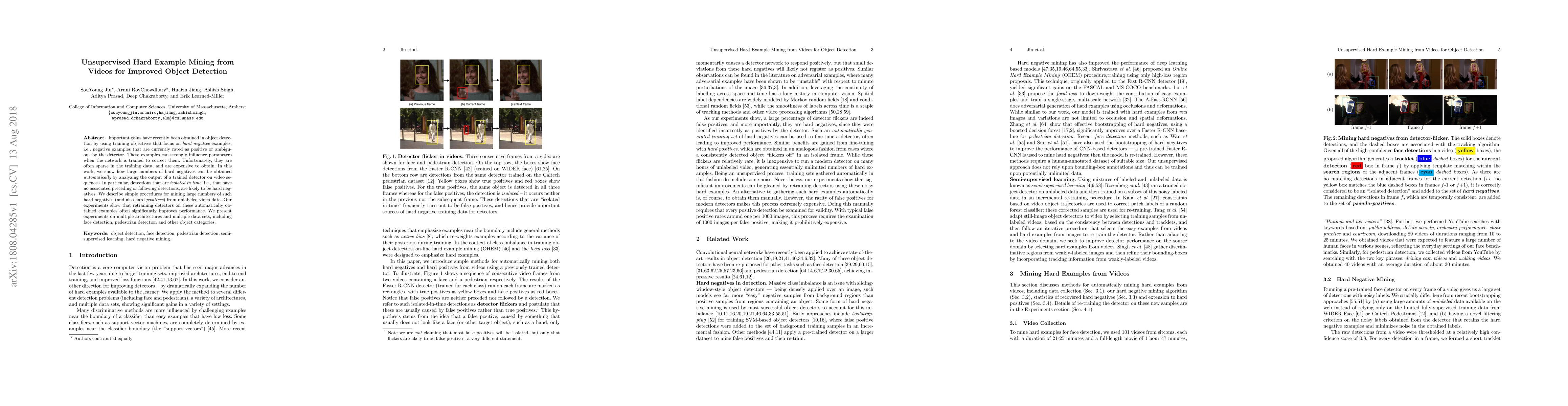 This paper proposes an unsupervised method for mining hard negative examples from unlabeled video data to improve object detection. It identifies isolated detections in time as likely hard negatives and demonstrates that retraining detectors with these examples significantly enhances performance across various architectures and datasets.