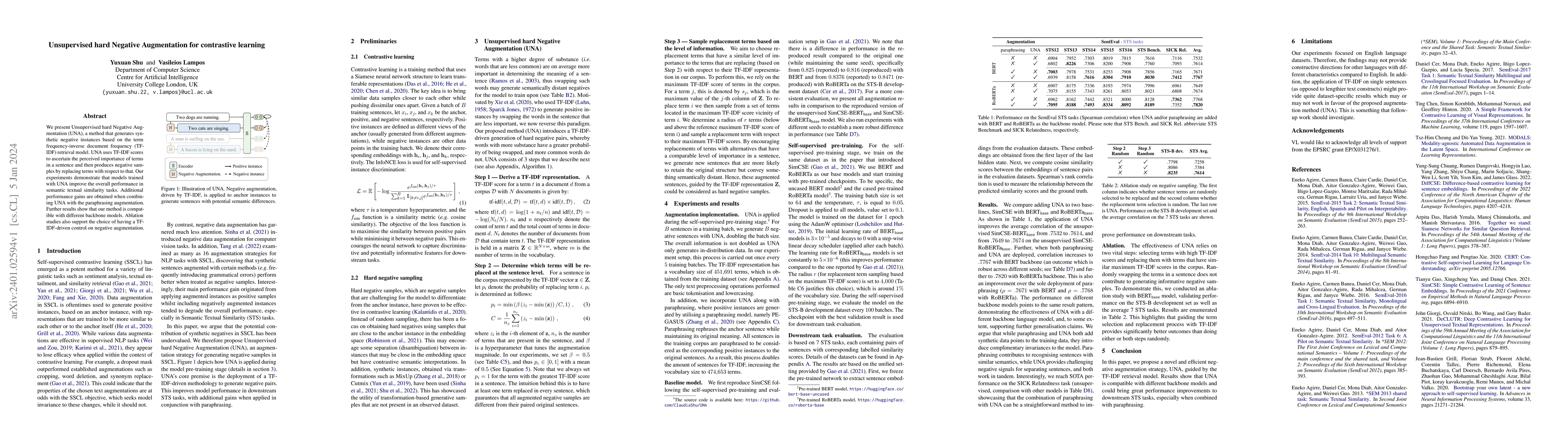 This paper introduces Unsupervised hard Negative Augmentation (UNA), which generates synthetic negative instances using TF-IDF retrieval to improve contrastive learning. Models trained with UNA show enhanced performance in semantic textual similarity tasks, especially when combined with paraphrasing augmentation.