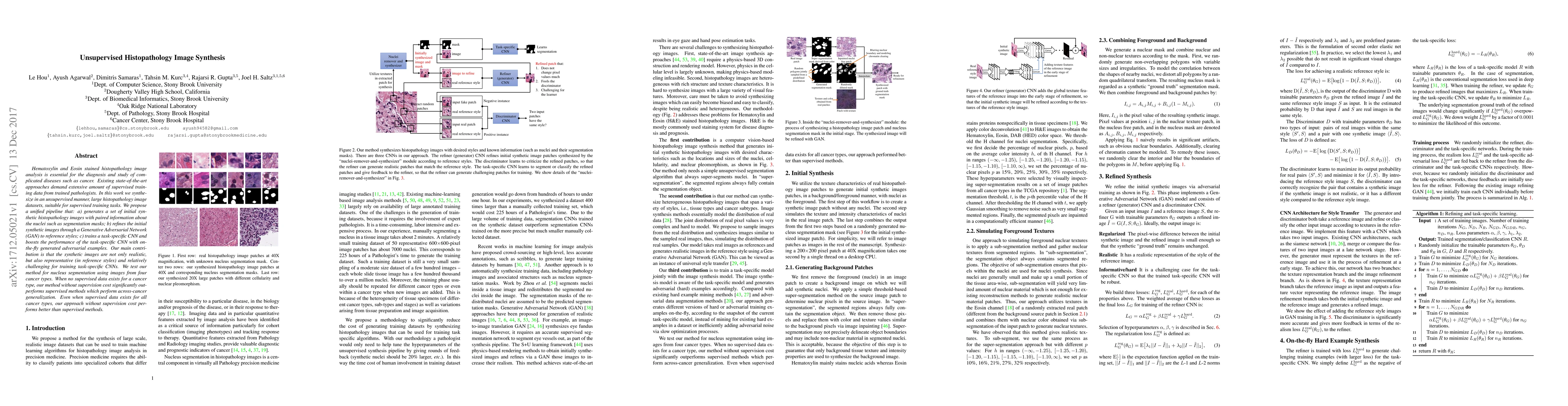 Hematoxylin and Eosin stained histopathology image analysis is essential for the diagnosis and study of complicated diseases such as cancer. Existing state-of-the-art approaches demand extensive amount of supervised training data from trained pathologists. In this work we synthesize in an unsupervised manner, large histopathology image datasets, suitable for supervised training tasks. We propose a unified pipeline that: a) generates a set of initial synthetic histopathology images with paired information about the nuclei such as segmentation masks; b) refines the initial synthetic images through a Generative Adversarial Network (GAN) to reference styles; c) trains a task-specific CNN and boosts the performance of the task-specific CNN with on-the-fly generated adversarial examples. Our main contribution is that the synthetic images are not only realistic, but also representative (in reference styles) and relatively challenging for training task-specific CNNs. We test our method for nucleus segmentation using images from four cancer types. When no supervised data exists for a cancer type, our method without supervision cost significantly outperforms supervised methods which perform across-cancer generalization. Even when supervised data exists for all cancer types, our approach without supervision cost performs better than supervised methods.