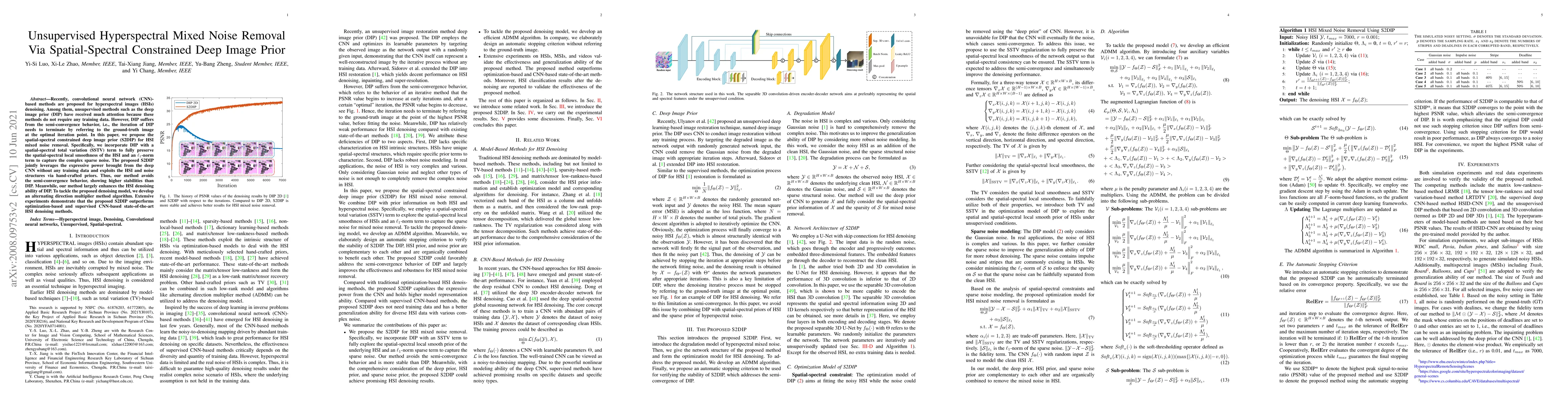 This paper proposes a spatial-spectral constrained deep image prior (S2DIP) for unsupervised hyperspectral image (HSI) denoising, addressing the semi-convergence issue of deep image prior (DIP) by incorporating spatial-spectral total variation and $\ell_1$-norm terms. The method outperforms state-of-the-art optimization-based and supervised CNN-based denoising techniques.