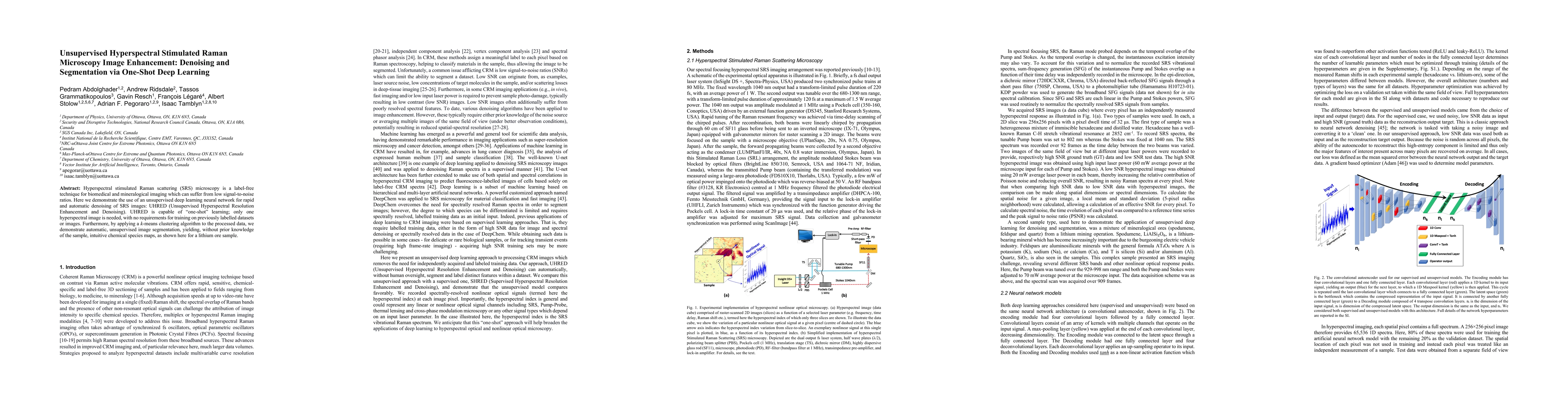 This paper presents UHRED, an unsupervised deep learning neural network for enhancing hyperspectral stimulated Raman scattering (SRS) microscopy images through denoising and segmentation. UHRED enables one-shot learning from a single image, eliminating the need for labeled datasets, and uses k-means clustering for automatic segmentation, as demonstrated with a lithium ore sample.