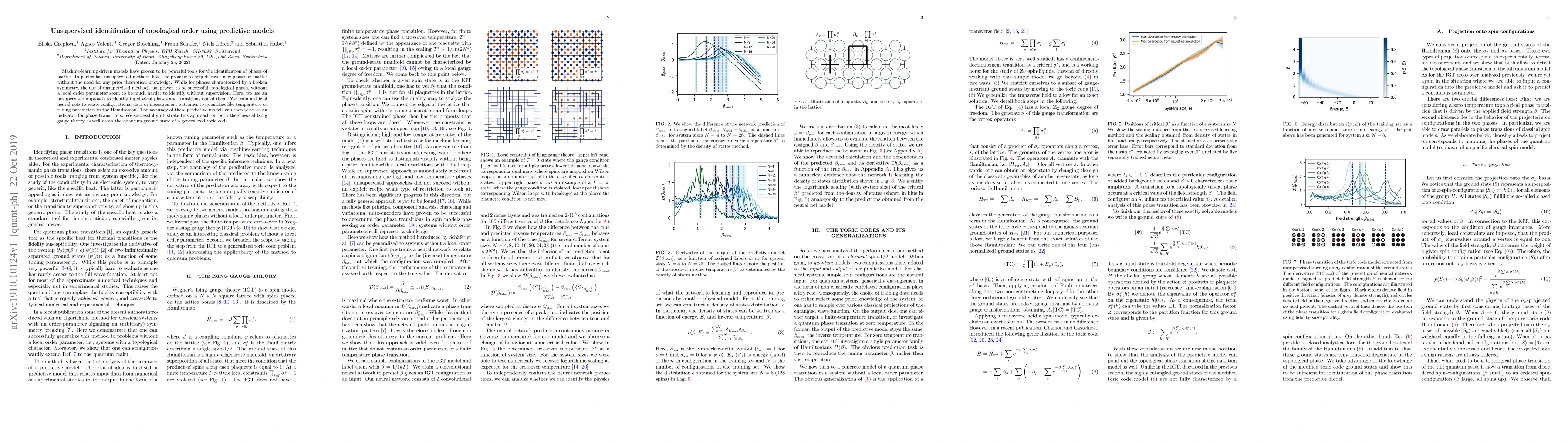 Machine-learning driven models have proven to be powerful tools for the identification of phases of matter. In particular, unsupervised methods hold the promise to help discover new phases of matter without the need for any prior theoretical knowledge. While for phases characterized by a broken symmetry, the use of unsupervised methods has proven to be successful, topological phases without a local order parameter seem to be much harder to identify without supervision. Here, we use an unsupervised approach to identify topological phases and transitions out of them. We train artificial neural nets to relate configurational data or measurement outcomes to quantities like temperature or tuning parameters in the Hamiltonian. The accuracy of these predictive models can then serve as an indicator for phase transitions. We successfully illustrate this approach on both the classical Ising gauge theory as well as on the quantum ground state of a generalized toric code.