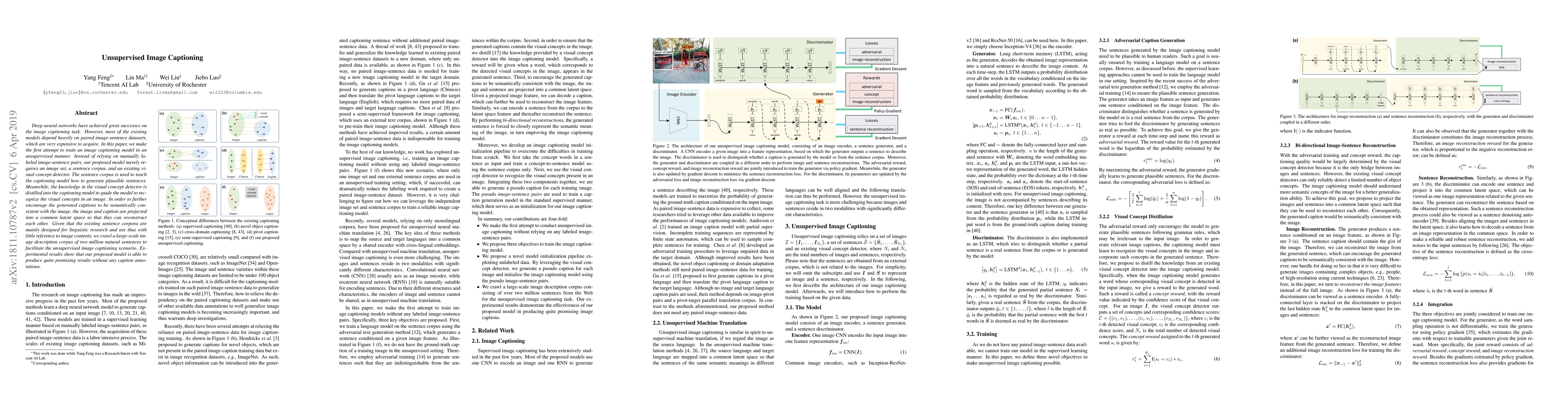 This paper proposes an unsupervised image captioning model that generates plausible sentences without relying on paired image-sentence datasets. It uses a sentence corpus and a visual concept detector to guide caption generation and semantic consistency, achieving promising results without any caption annotations.
