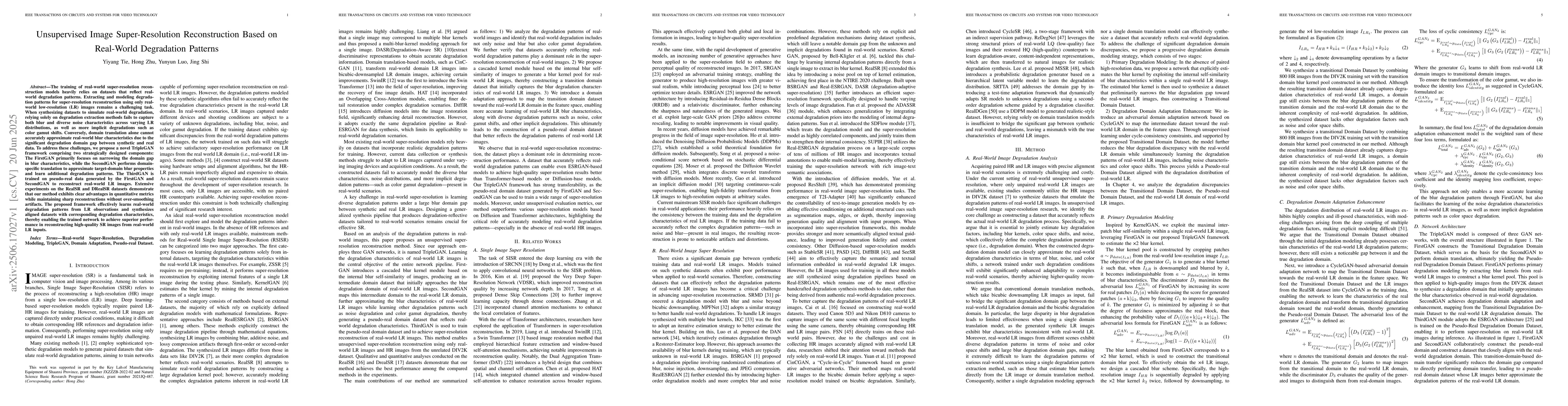 The training of real-world super-resolution reconstruction models heavily relies on datasets that reflect real-world degradation patterns. Extracting and modeling degradation patterns for super-resolution reconstruction using only real-world low-resolution (LR) images remains a challenging task. When synthesizing datasets to simulate real-world degradation, relying solely on degradation extraction methods fails to capture both blur and diverse noise characteristics across varying LR distributions, as well as more implicit degradations such as color gamut shifts. Conversely, domain translation alone cannot accurately approximate real-world blur characteristics due to the significant degradation domain gap between synthetic and real data. To address these challenges, we propose a novel TripleGAN framework comprising two strategically designed components: The FirstGAN primarily focuses on narrowing the domain gap in blur characteristics, while the SecondGAN performs domain-specific translation to approximate target-domain blur properties and learn additional degradation patterns. The ThirdGAN is trained on pseudo-real data generated by the FirstGAN and SecondGAN to reconstruct real-world LR images. Extensive experiments on the RealSR and DRealSR datasets demonstrate that our method exhibits clear advantages in quantitative metrics while maintaining sharp reconstructions without over-smoothing artifacts. The proposed framework effectively learns real-world degradation patterns from LR observations and synthesizes aligned datasets with corresponding degradation characteristics, thereby enabling the trained network to achieve superior performance in reconstructing high-quality SR images from real-world LR inputs.