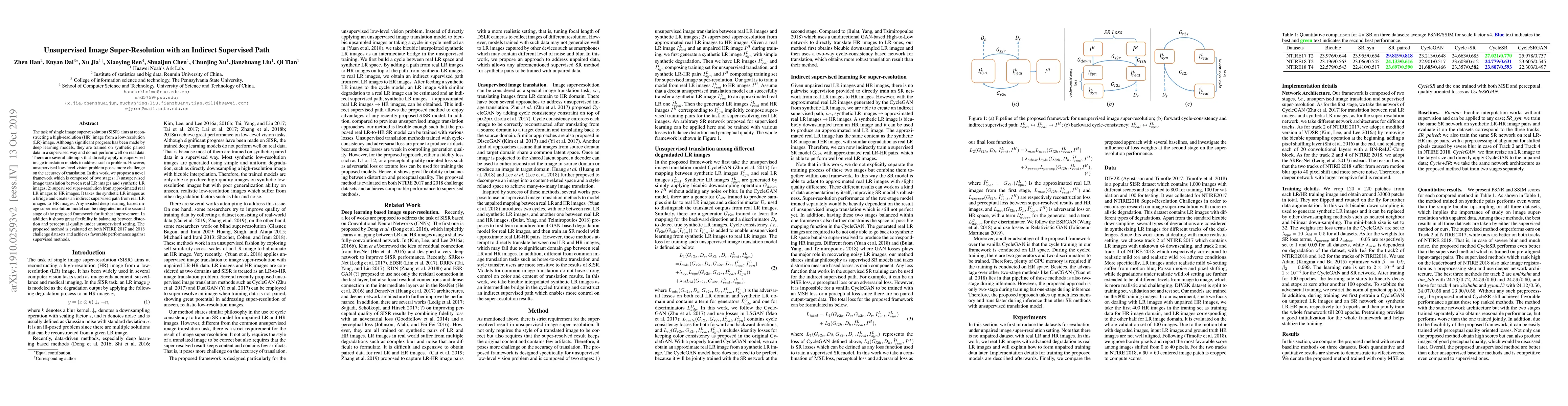 This paper proposes a novel two-stage framework for unsupervised image super-resolution, utilizing an indirect supervised path via synthetic images to bridge real low-resolution images to high-resolution outputs. The method demonstrates favorable performance compared to supervised approaches on benchmark datasets.