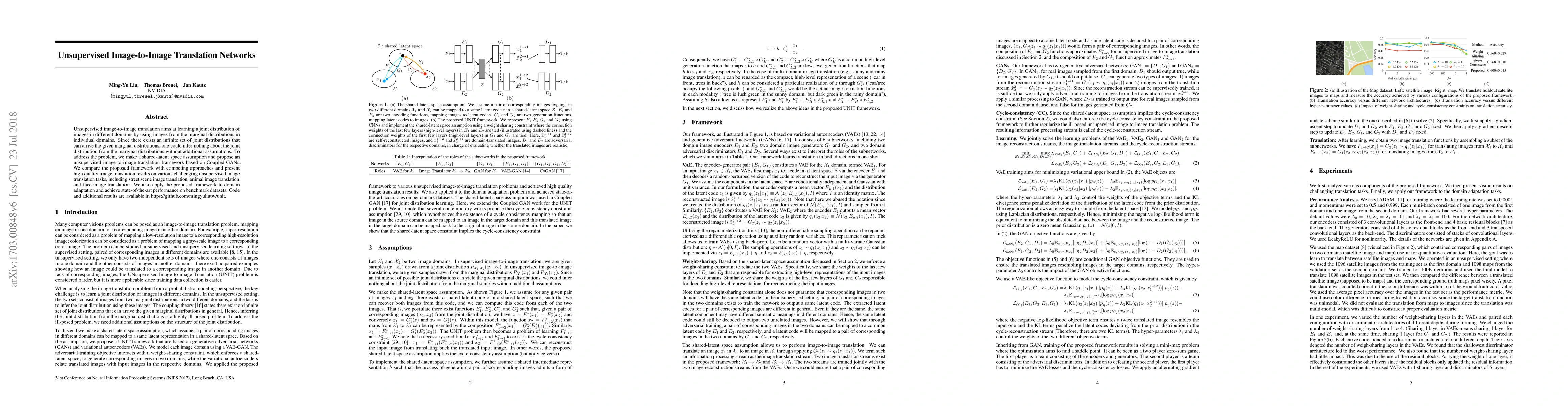 Unsupervised image-to-image translation aims at learning a joint distribution of images in different domains by using images from the marginal distributions in individual domains. Since there exists an infinite set of joint distributions that can arrive the given marginal distributions, one could infer nothing about the joint distribution from the marginal distributions without additional assumptions. To address the problem, we make a shared-latent space assumption and propose an unsupervised image-to-image translation framework based on Coupled GANs. We compare the proposed framework with competing approaches and present high quality image translation results on various challenging unsupervised image translation tasks, including street scene image translation, animal image translation, and face image translation. We also apply the proposed framework to domain adaptation and achieve state-of-the-art performance on benchmark datasets. Code and additional results are available in https://github.com/mingyuliutw/unit .