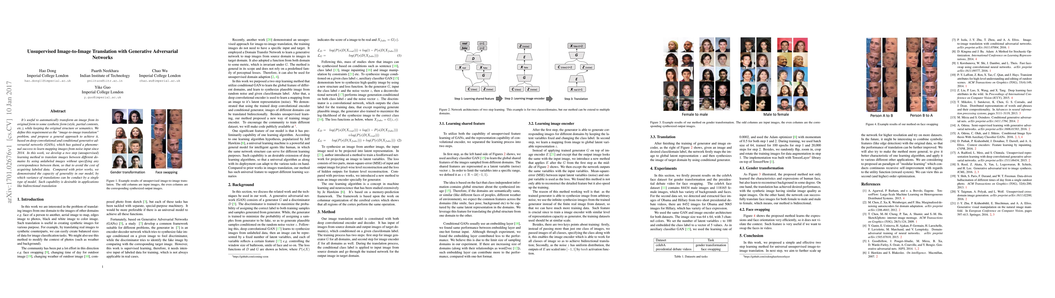 It's useful to automatically transform an image from its original form to some synthetic form (style, partial contents, etc.), while keeping the original structure or semantics. We define this requirement as the "image-to-image translation" problem, and propose a general approach to achieve it, based on deep convolutional and conditional generative adversarial networks (GANs), which has gained a phenomenal success to learn mapping images from noise input since 2014. In this work, we develop a two step (unsupervised) learning method to translate images between different domains by using unlabeled images without specifying any correspondence between them, so that to avoid the cost of acquiring labeled data. Compared with prior works, we demonstrated the capacity of generality in our model, by which variance of translations can be conduct by a single type of model. Such capability is desirable in applications like bidirectional translation